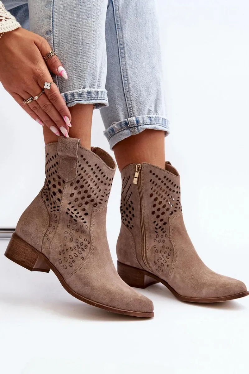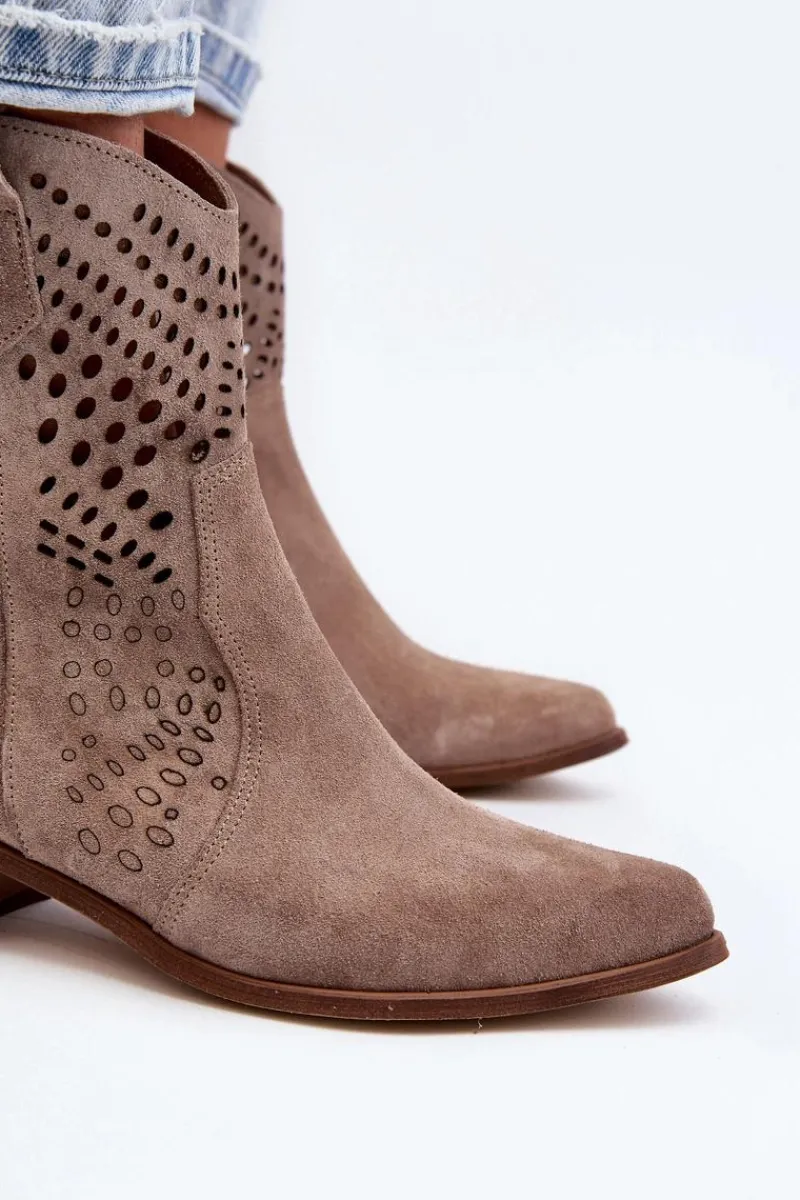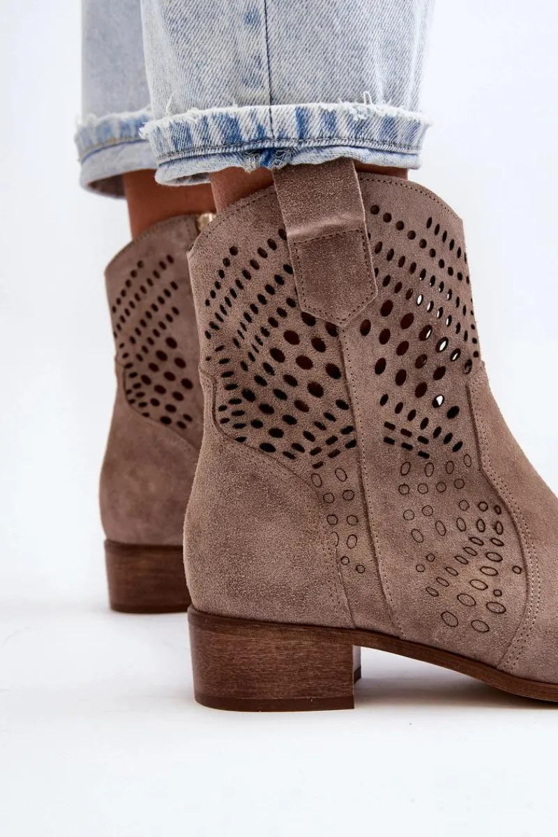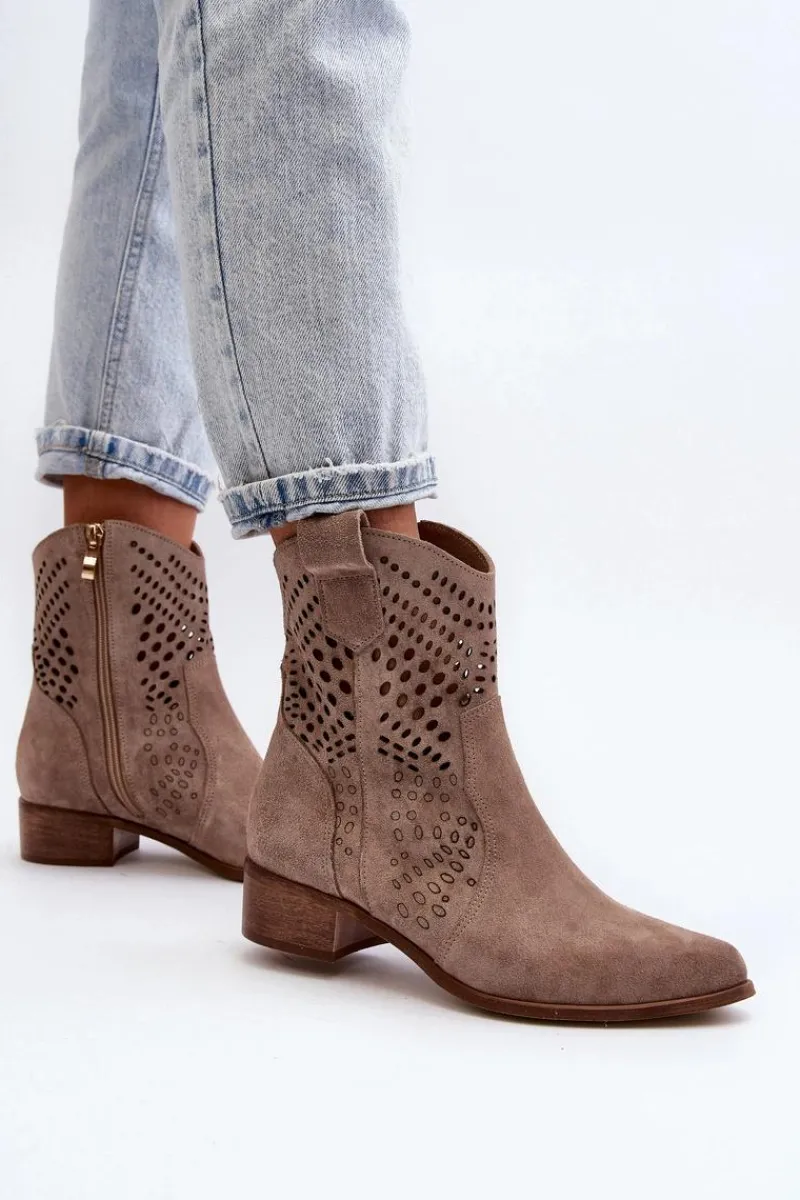 Botki damskie to doskonały wybór na sezon jesienno-zimowy! Wykonane z naturalnego zamszu. Osadzone na niskim obcasie. Ażurowy wzorek na cholewce dodaje im elegancji. Model ten zapinany jest na zamek. Miękka wkładka gwarantuje komfort noszenia. Przy wyborze rozmiaru prosimy sugerować się tabelą rozmiarów.