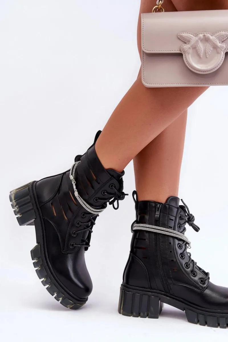 Niezwykłe i stylowe botki wykonane z eko skóry. Zapinane są z boku cholewki na zamek oraz dodatkowo sznurowane. Botki posiadają usztywniany zapiętek. Ozdobny, odpinany paseczek został wzbogacony dżetami imitującymi cyrkonie. Botki zostały wykonane z eko skóry z modnymi przecięciami. Osadzono je na masywnym, płaskim obcasie i platformie. Przy wyborze rozmiaru prosimy sugerować się tabelą rozmiarów.