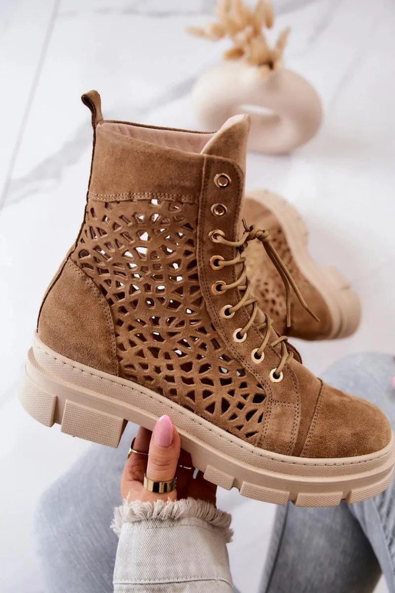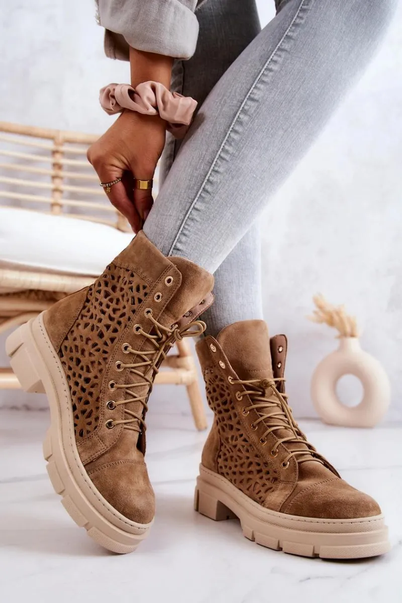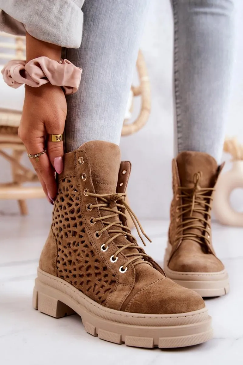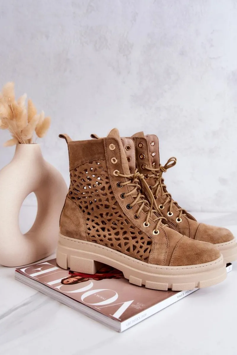 Botki Wiosenne|Botki Sznurowane>Boto Zamszowe Ażurowe Botki Camel Aileen