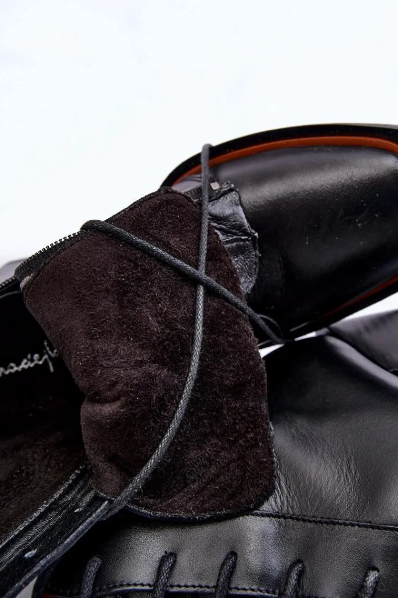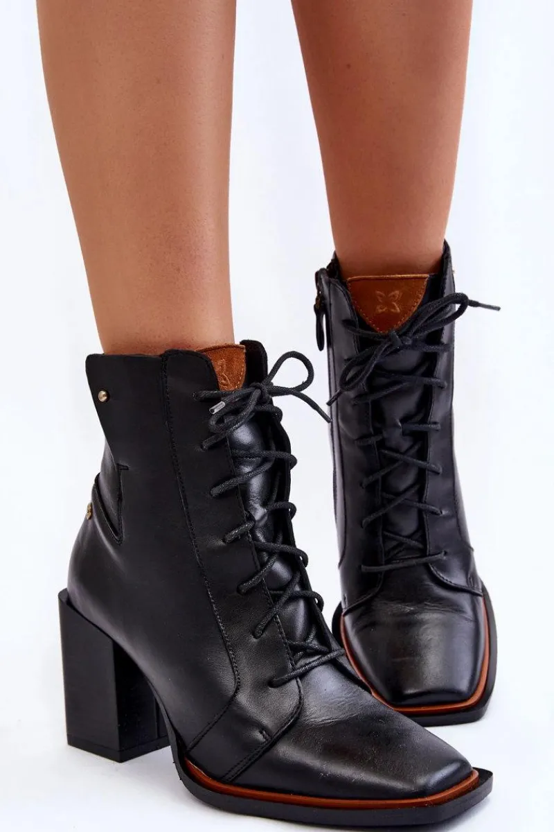 Damskie botki marki Maciejka zostały wykonane z wysokiej jakości naturalnej skóry. Model klasycznie sznurowany oraz zamykany na suwak. Botki posiadają modny, kwadratowy nosek. Zapiętek jest usztywniany. Miękka wkładka zapewni wygodę przez cały dzień. Botki osadzono na obcasie w postaci wyższego klocka. Przy wyborze rozmiaru prosimy sugerować się tabelą rozmiarów.