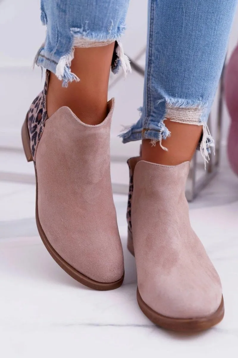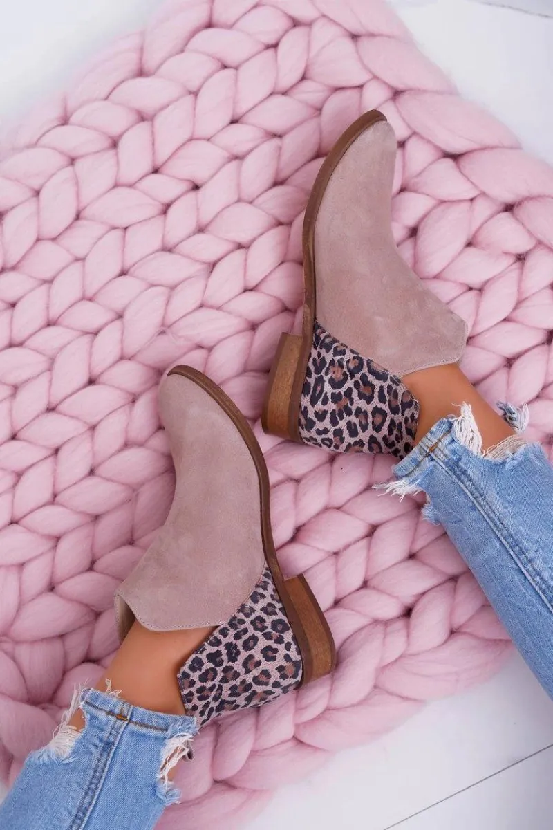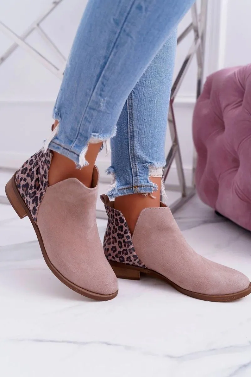 Botki to nie tylko buty na chłodne dni. Świetnie sprawdzą się również podczas tworzenia wiosennych stylizacjach. Botki posiadają delikatne wycięcia na wysokości kostek. Płaski obcas oraz wzór w panterkę, który stał się bardzo modny w tym sezonie. Botki w całości wykonane ze skóry zamszowej. Produkt Polski, co gwarantuje nam komfort oraz wysoką jakość wykonania. Idealne do zwiewnych sukienek oraz jeansowych spodni. Przy wyborze rozmiaru prosimy sugerować się tabelą rozmiarów.