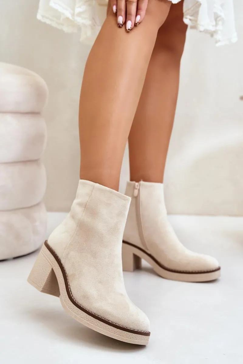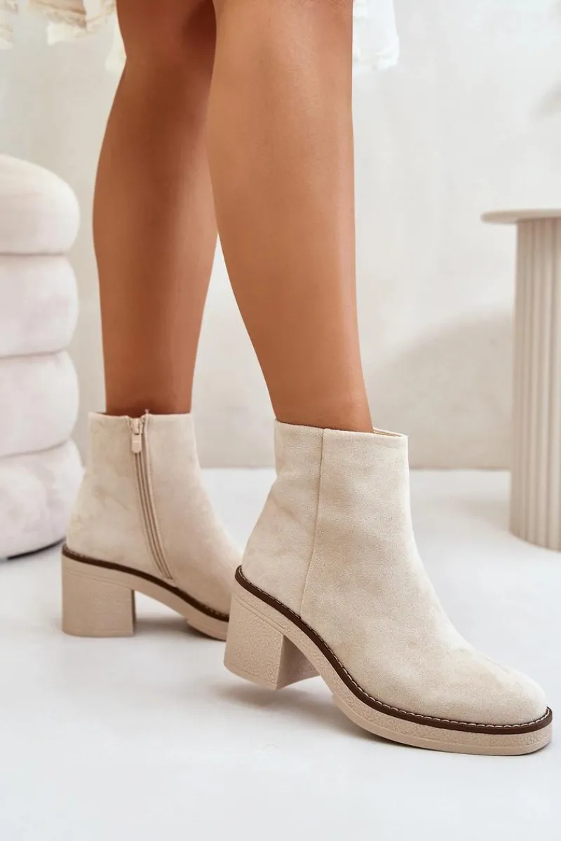 Damskie botki wykonane z eko zamszu. Osadzone na masywnym obcasie typu słupek. Posiadają zaokrąglone noski i praktyczne zapięcie na zamek. Wnętrze ocieplone kocem obuwniczym, co zapewnia komfort w chłodniejsze dni. Ten model z pewnością będzie świetnym dodatkiem do wielu jesiennych stylizacji. Przy wyborze rozmiaru prosimy sugerować się tabelą rozmiarów.