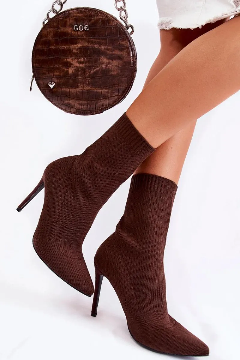 Botki posiadają modną, skarpetkową cholewkę za kostkę. Osadzone na obcasie typu szpilka. Nosek w szpic świetnie wysmukli stopę. Model wsuwany. Wykonane z elastycznego materiału, który idealnie dopasuje się do nogi. Wkładka z eko skóry. Buty posiadają usztywniany zapiętek. Idealne buty do jeansów czy dłuższych, koszulowych sukienek.Przy wyborze rozmiaru prosimy sugerować się tabelą rozmiarów.