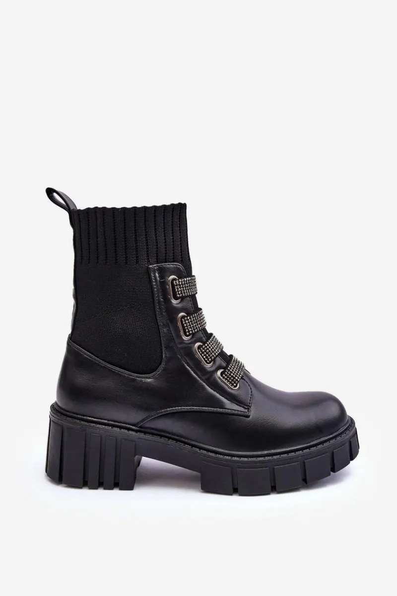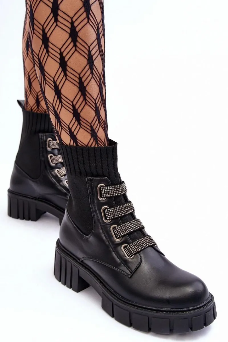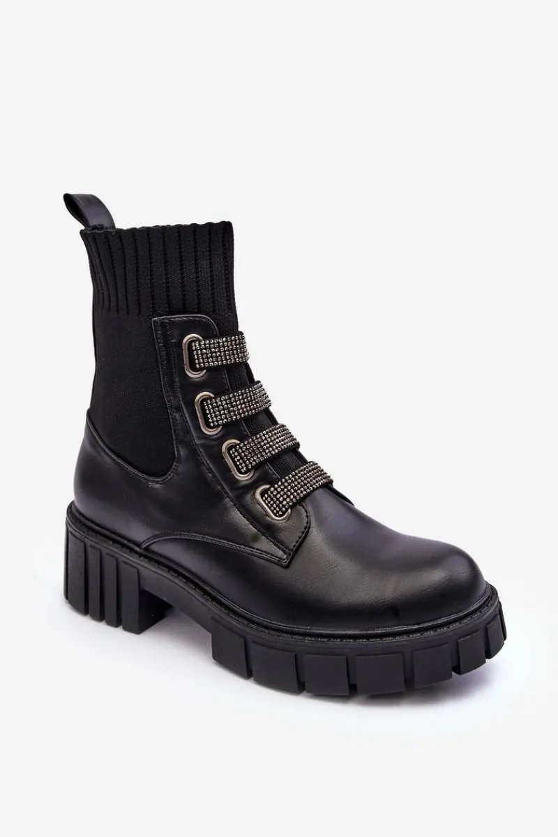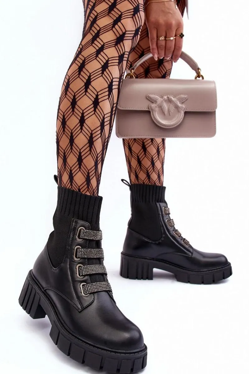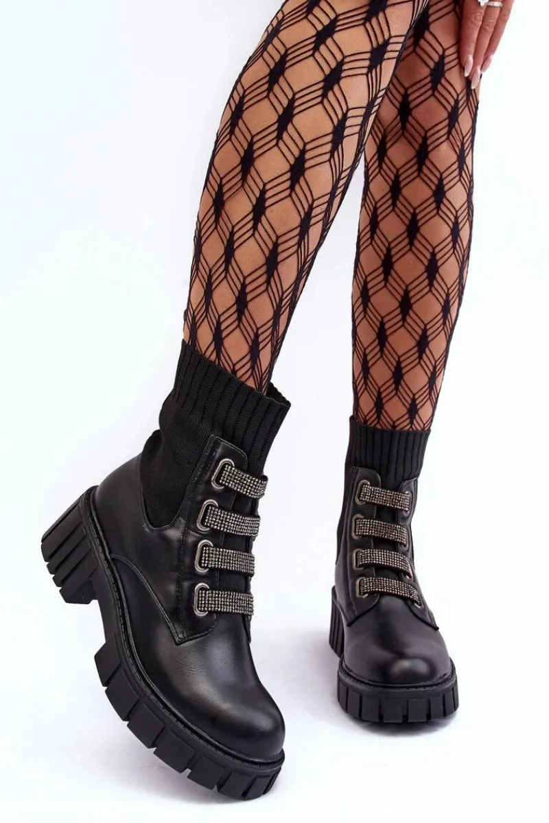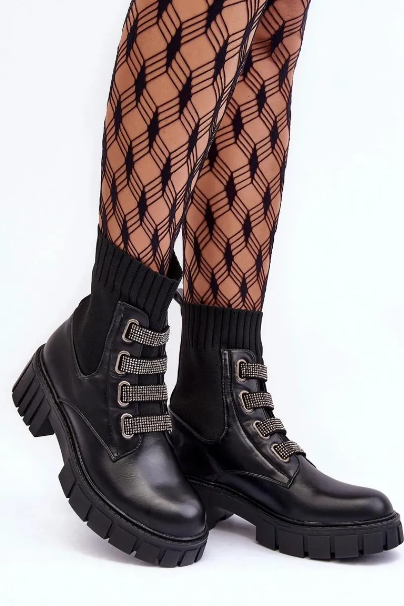 Botki damskie osadzone na płaskim obcasie i platformie. Wykonane z połączenia eko skóry i tkaniny. Z przodu znajdują się ozdobione małymi dżetami paski. Model wsuwany z elastyczną cholewką w formie skarpety. Ocieplenie kocem obuwniczym na wysokości stopy. Idealne do jesiennych stylizacji! Przy wyborze rozmiaru prosimy sugerować się tabelą rozmiarów.