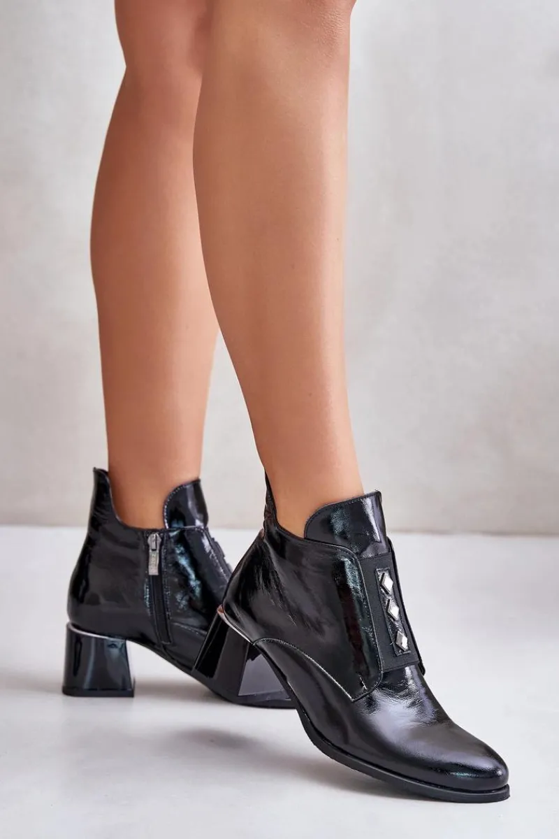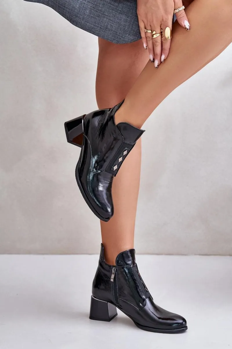 Damskie botki z cholewką za kostkę. Wykonane z wysokiej jakości skóry naturalnej. Osadzone na obcasie w postaci klocka. Ocieplenie filcem zapewni ciepło w chłodniejsze dni. Zapinane na zamek. Noski w migdał. Elegancki fason, który z pewnością dopasujesz do wielu stylizacji! Przy wyborze rozmiaru prosimy kierować się tabelą rozmiarów.