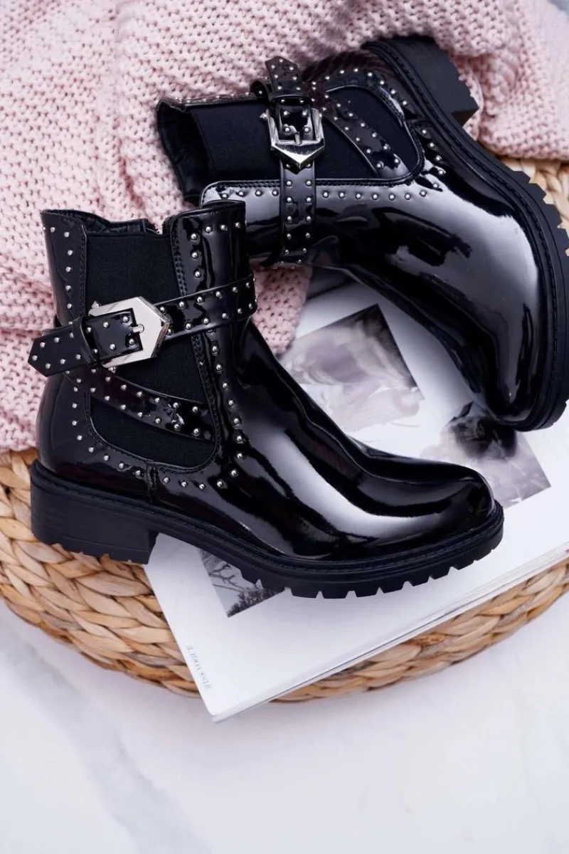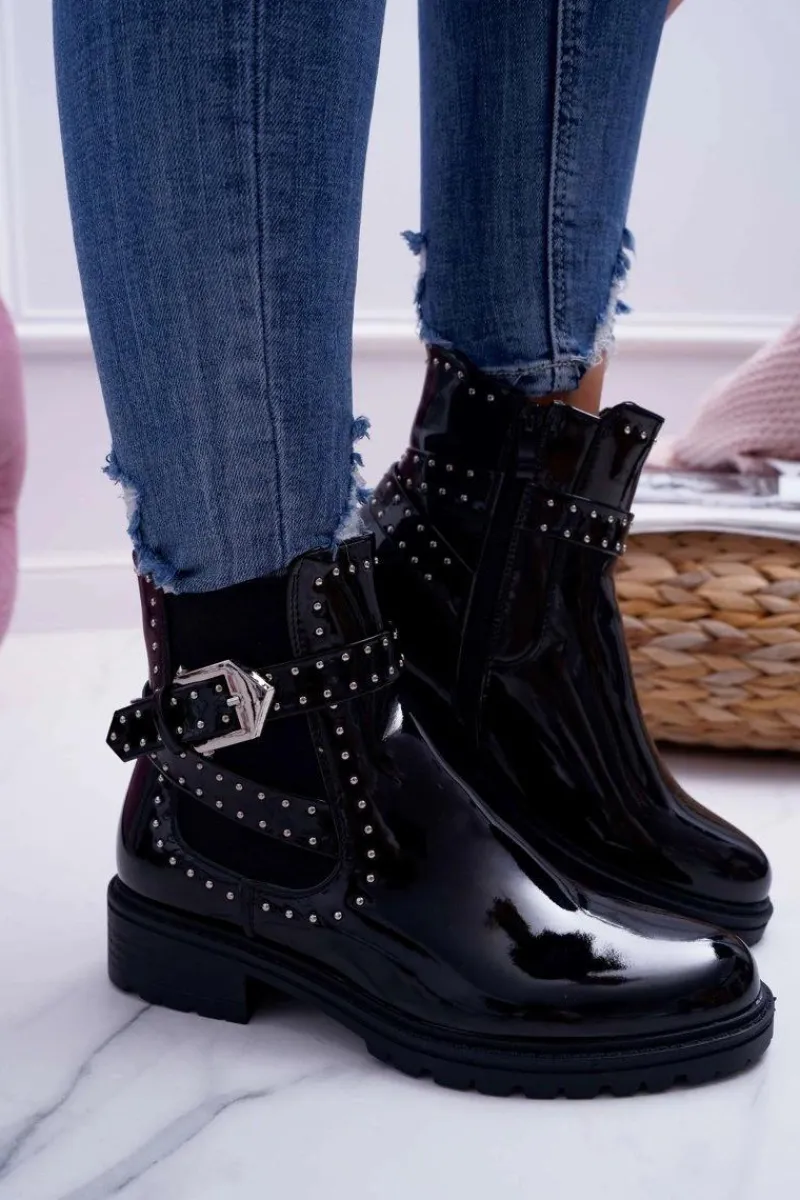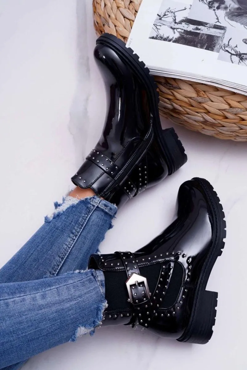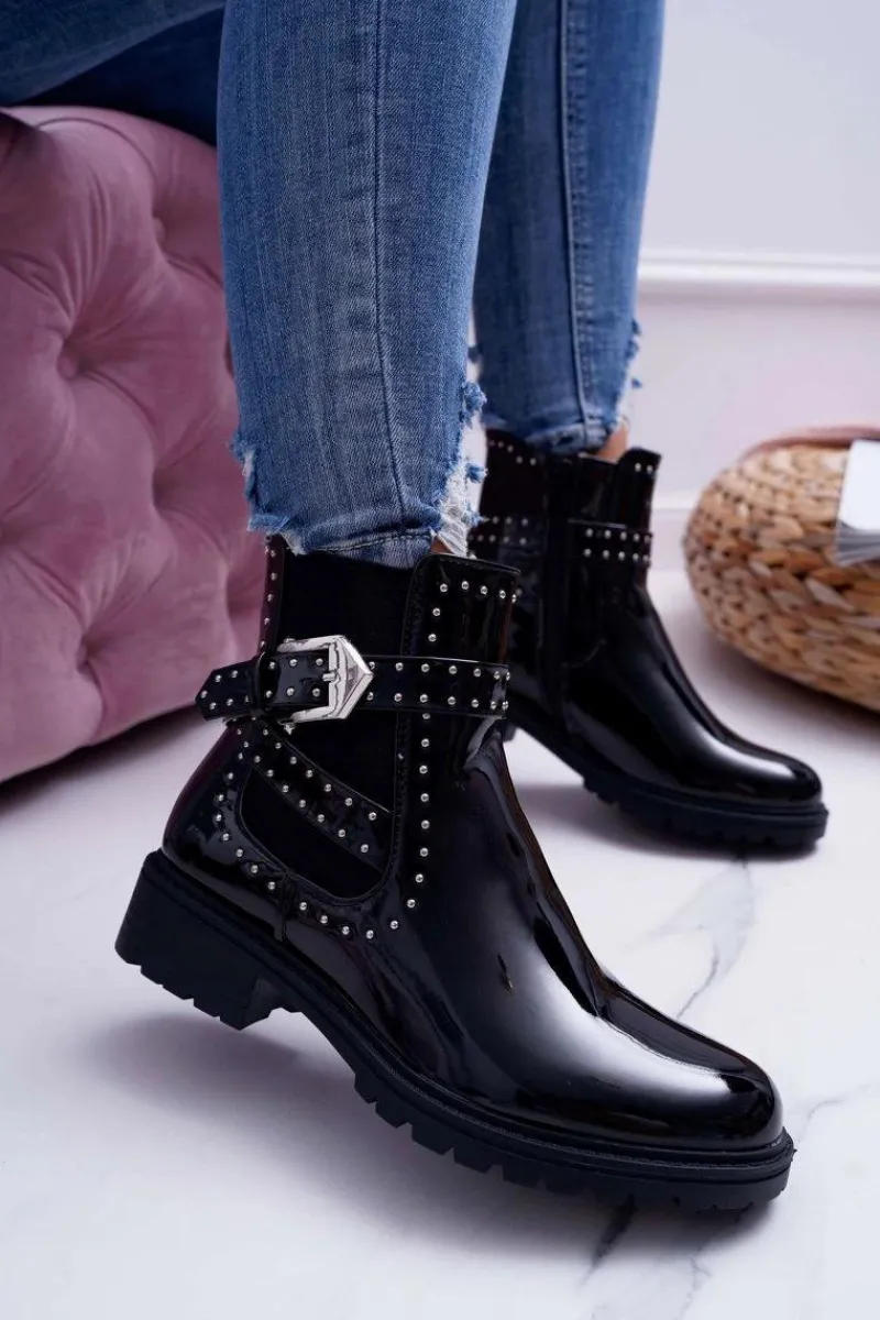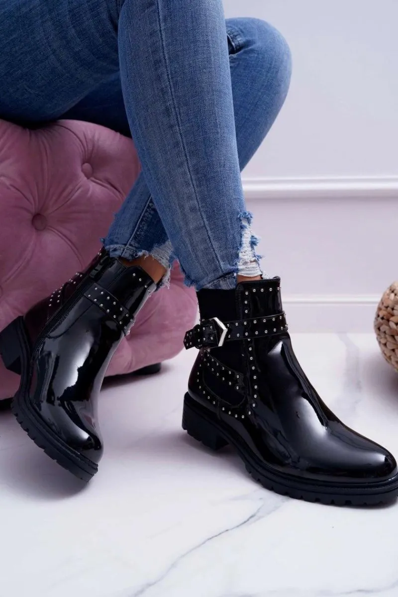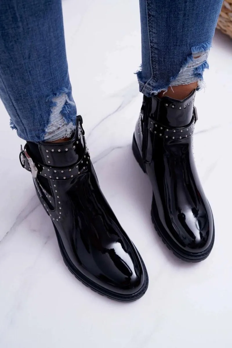 Botki Zimowe Damskie|Botki Płaskie>Boto Botki Damskie Płaski Obcas Ciepłe Lakierowane Czarne Verre