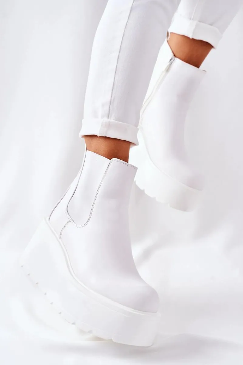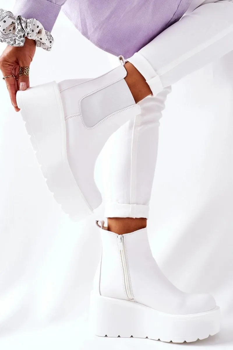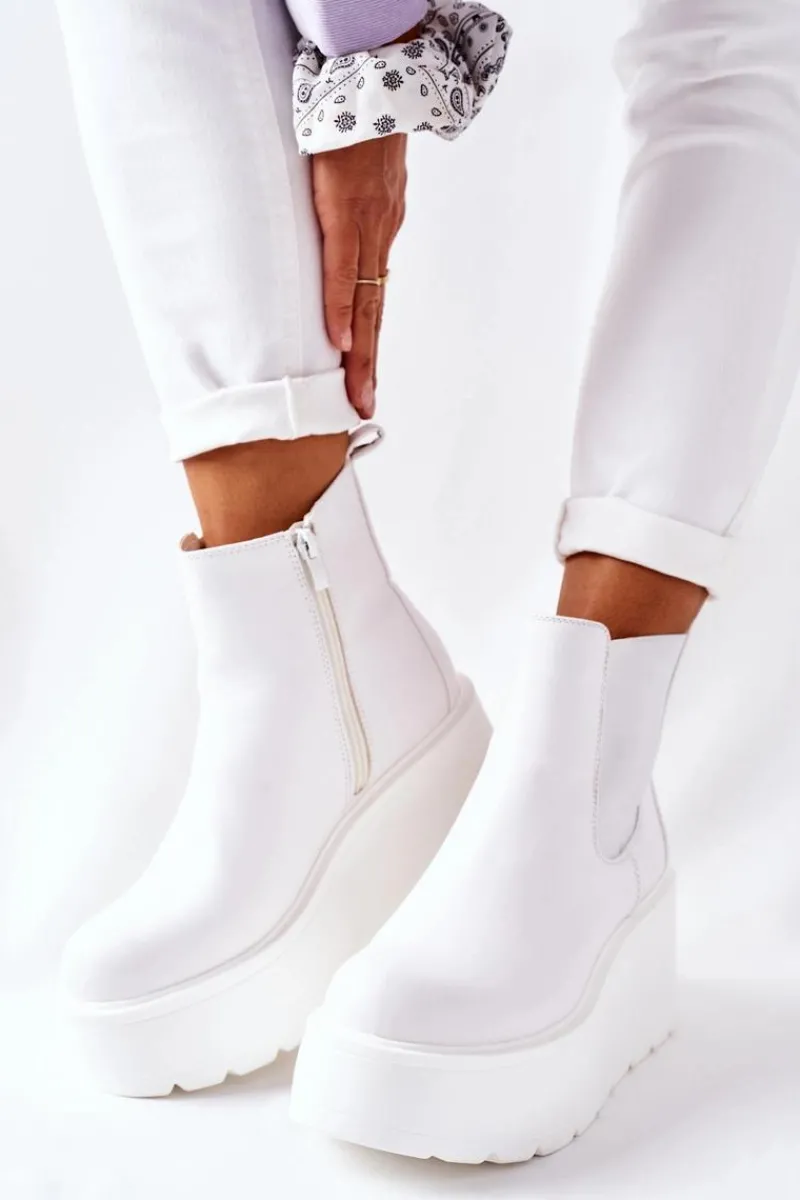 Botki damskie wykonane z eko skóry. Wnętrze botków ocieplone jest miłym w dotyku kocem obuwniczym. Wysoka platforma. Przy wyborze rozmiaru prosimy sugerować się tabelą rozmiarów.