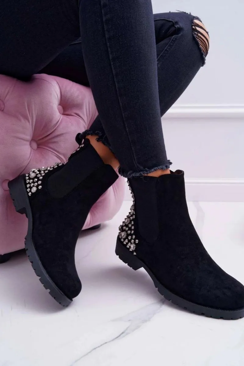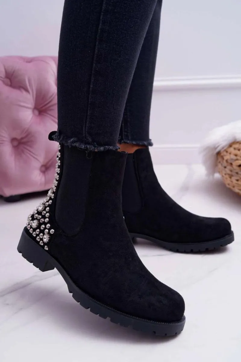 Botki Zimowe Damskie|Botki Zamszowe>Boto Botki Damskie Płaski Obcas Dżety Ćwieki Czarne Binary