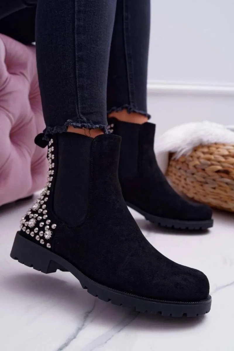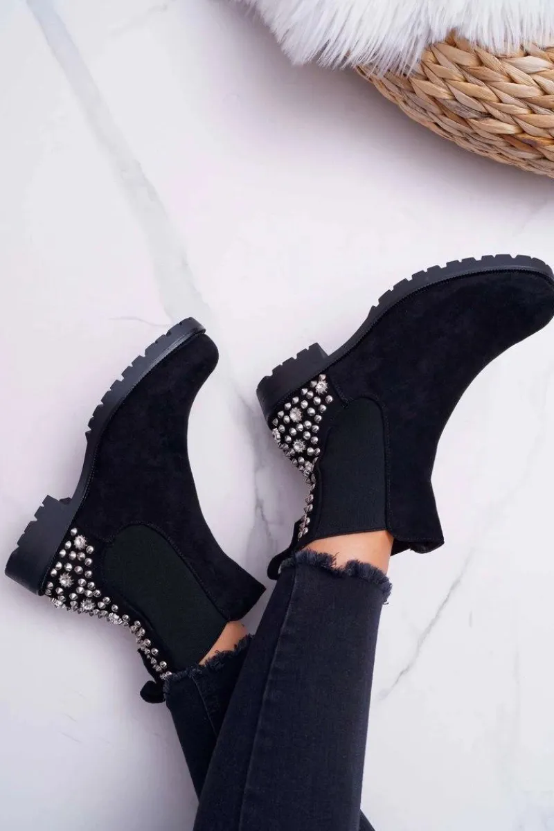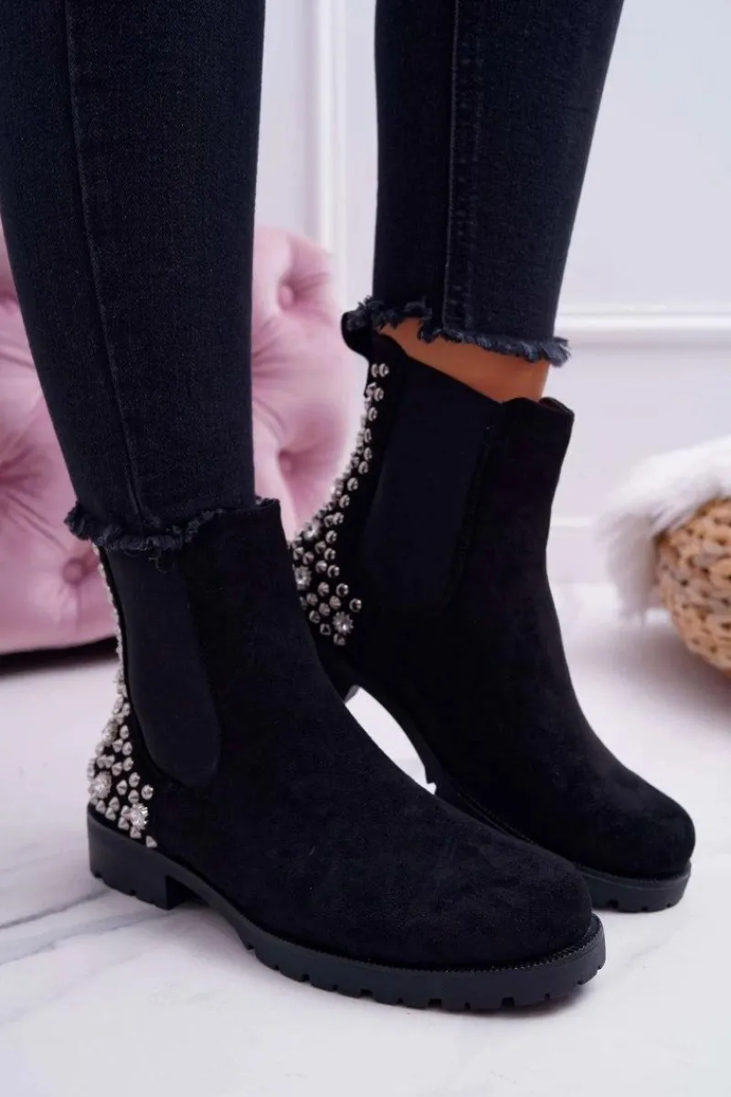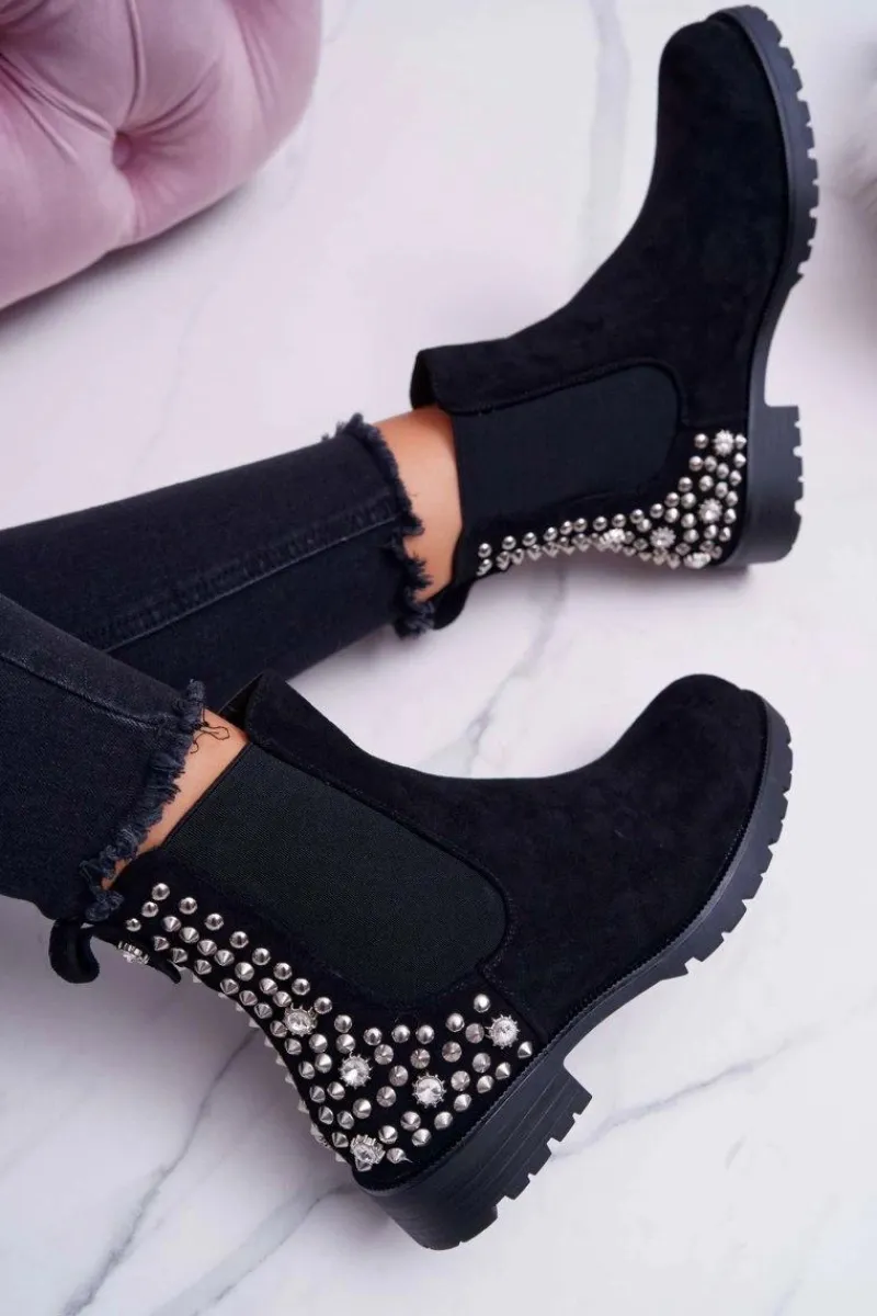 Interesująca propozycja wsuwanych botków. Cholewka ozdobiona dżetami, kryształkami i ćwiekami. Proste zakładanie dzięki elastycznym gumkom po bokach. Musisz mieć ten model w swojej szafie! Przy wyborze rozmiaru prosimy sugerować się tabelą rozmiarów