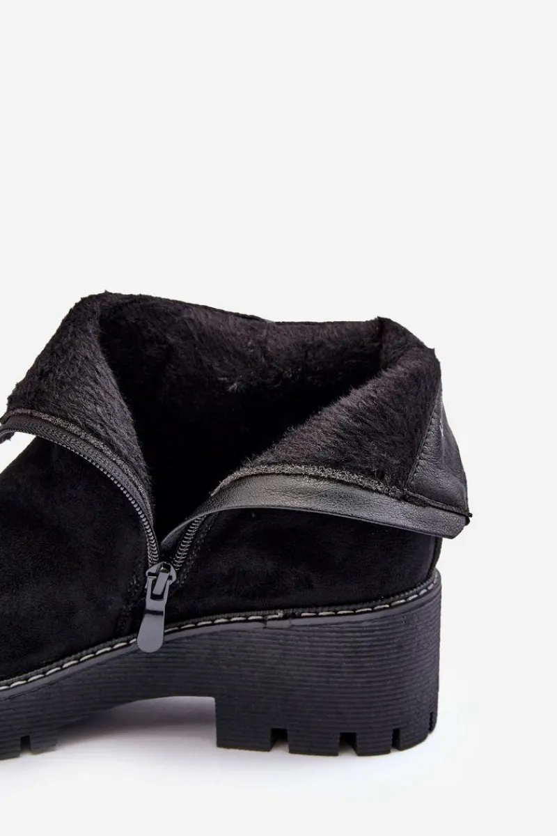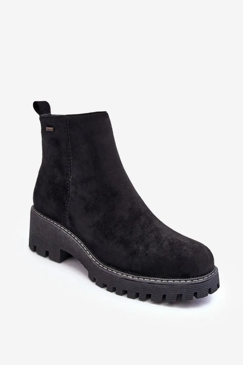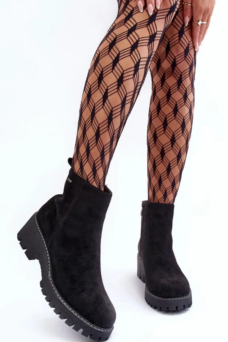Klasyczne botki damskie osadzone na płaskim, stabilnym obcasie i platformie. Wykonane z eko zamszu. Zapinane na suwak po wewnętrznej stronie cholewki. Zapiętek jest usztywniony, noski zaokrąglone. Wnętrze ocieplone kocem obuwniczym. Świetny model na chłodniejsze dni! Przy wyborze rozmiaru prosimy sugerować się tabelą rozmiarów.