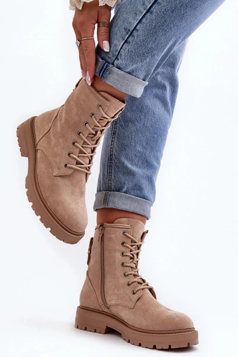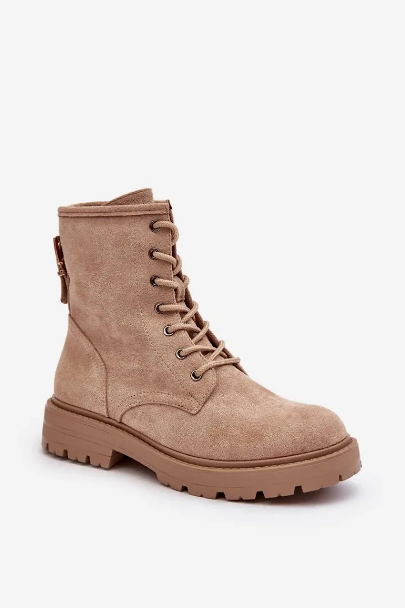 Klasyczne botki damskie wykonane z eko zamszu. Osadzone na platformie oraz płaskim obcasie. Model ten zapinany jest na suwak oraz dodatkowo posiada sznurowanie. Noski zaokrąglone. Zapiętek usztywniany pozwoli na odpowiednią stabilizację stopy. Z tyłu cholewki krótki pasek z klamrą. Koniecznie powinnaś je mieć! Przy wyborze rozmiaru prosimy sugerować się tabelą rozmiarów.