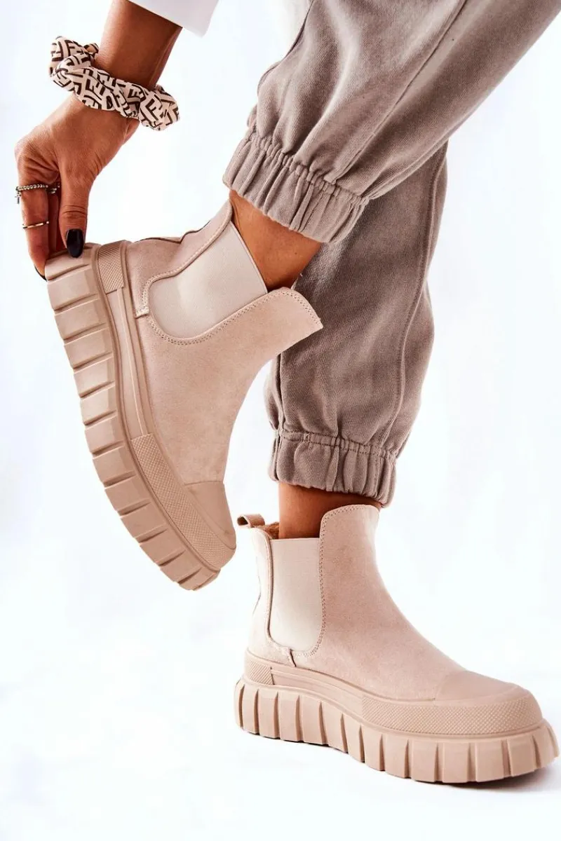 Botki zostały wykonane z eko zamszu. Gumy ściągające na wysokości cholewki zapewnią dopasowanie do nogi oraz wygodę. Wysoka platforma sprawia, że buty są komfortowe w noszeniu. Środek jest ocieplony delikatnym, przyjemnym w dotyku futerkiem. Botki posiadają wzmocnienie na przodzie w postaci gumy. Przy wyborze rozmiaru prosimy sugerować się tabelą rozmiarów.