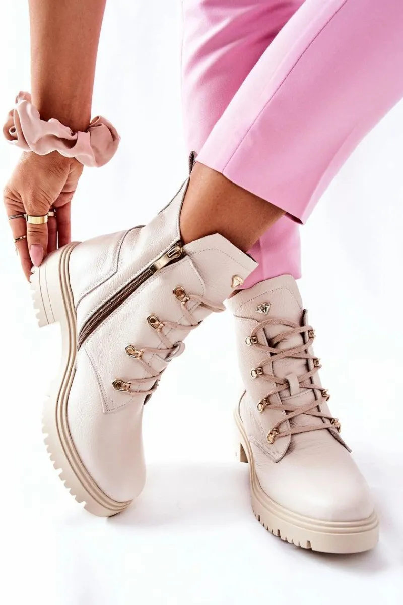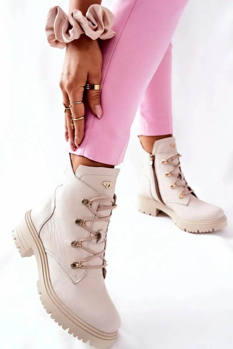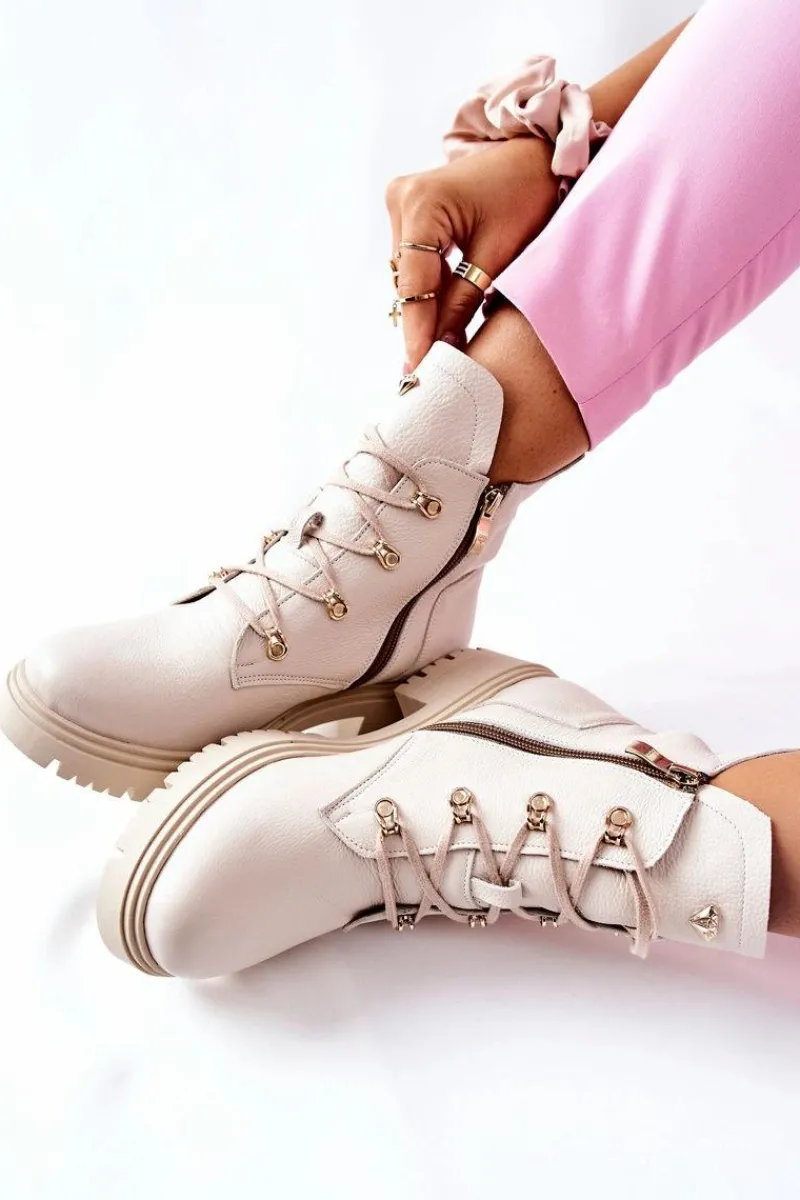 Buty zostały wykonane z naturalnego zamszu. Zdobienie w postaci złotego logo pięknie podkreśla ich wyjątkowy styl. Zakładanie ułatwi wszyty na boku suwak, natomiast o lepsze dopasowanie zadbają sznurowadła. Botki oparte na solidnym płaskim obcasie. Przy wyborze rozmiaru prosimy sugerować się tabelą rozmiarów.