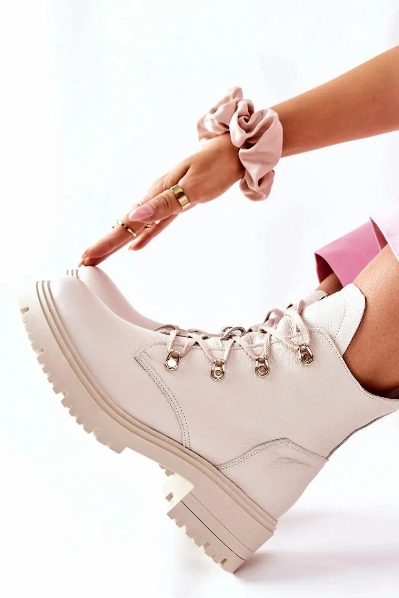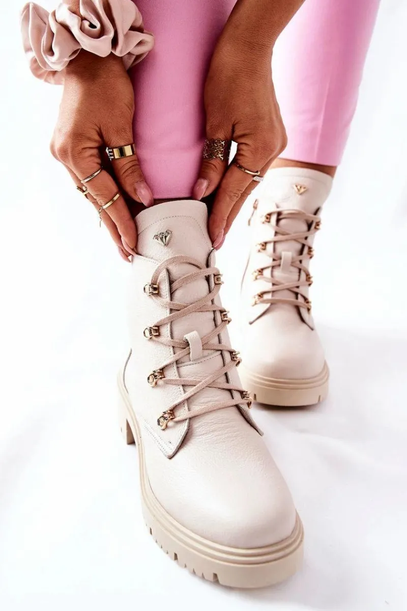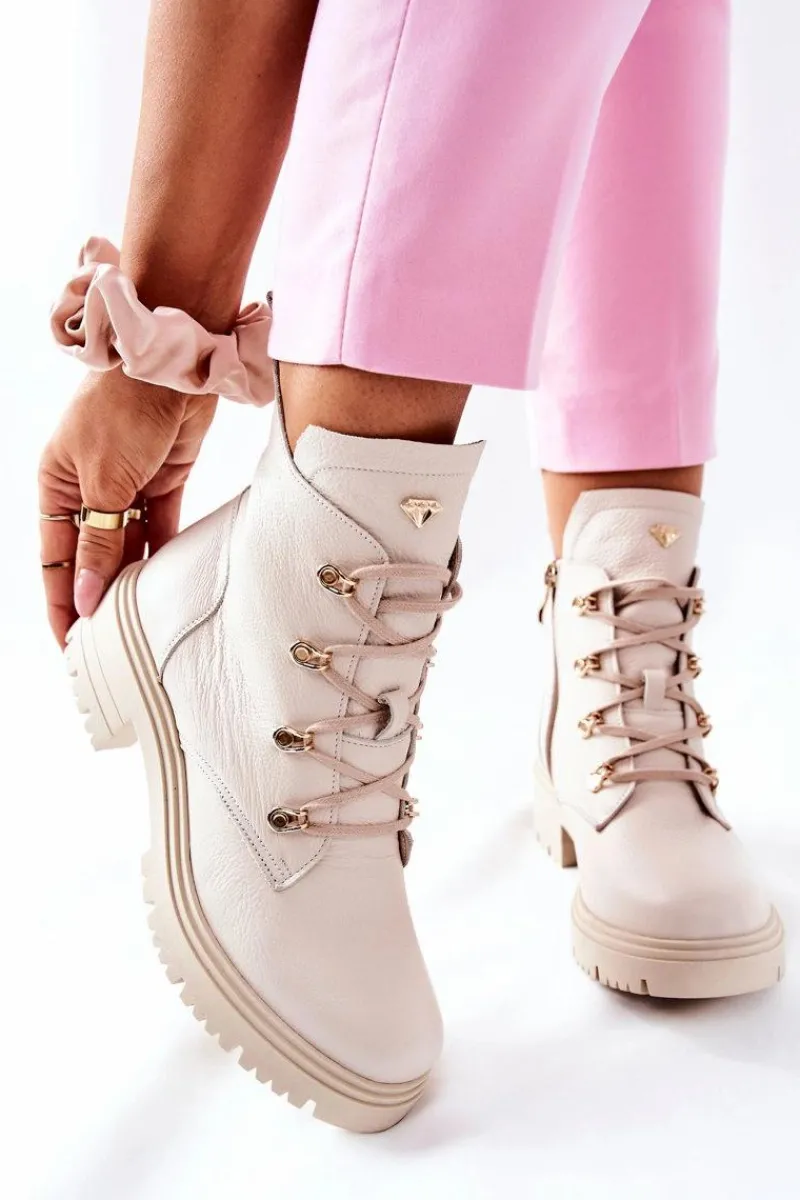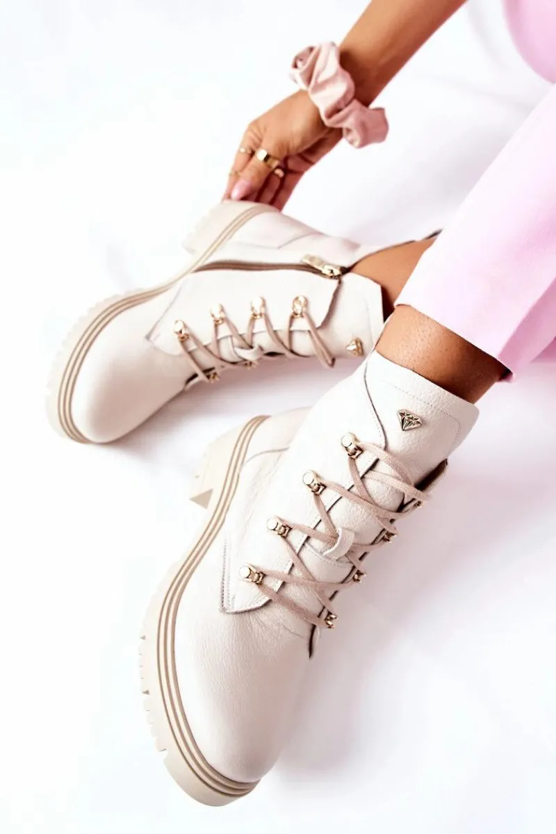 Buty zostały wykonane z naturalnego zamszu. Zdobienie w postaci złotego logo pięknie podkreśla ich wyjątkowy styl. Zakładanie ułatwi wszyty na boku suwak, natomiast o lepsze dopasowanie zadbają sznurowadła. Botki oparte na solidnym płaskim obcasie. Przy wyborze rozmiaru prosimy sugerować się tabelą rozmiarów.