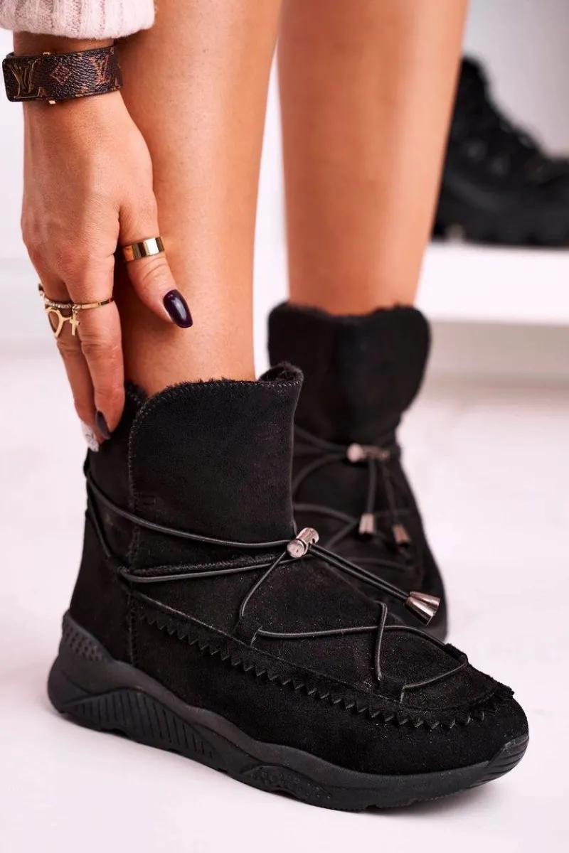 Świetnym wyborem na zimową porę są śniegowce! Wysoka cholewka oraz wnętrze pokryte ciepłym futerkiem. Śniegowce wykonane zostały z eko-zamszu a to w połączeniu ze sportową podeszwą daje niesamowity efekt! Idealne buty na chłodne zimowe dni! Zdobienie w postaci regulowanej gumki jest wspaniałym dodatkiem. Przy wyborze rozmiaru prosimy sugerować się tabelą rozmiarów.