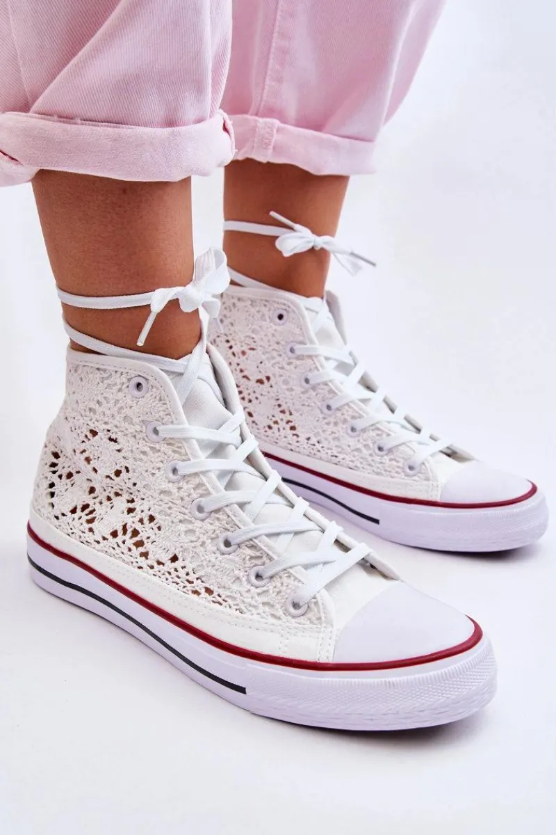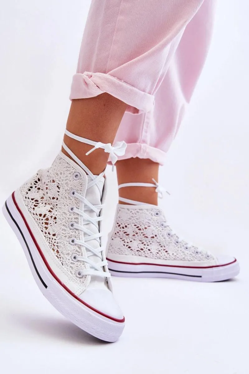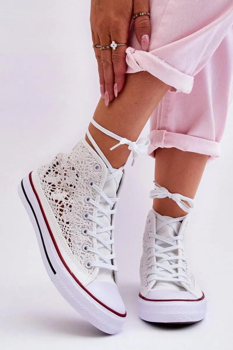 Wysokie trampki damskie zostały wykonane z materiału tekstylnego. Ażurowa cholewka świetnie sprawdzi się w cieplejsze dni, gdyż zapewnia odpowiednią wentylację obuwia. Model posiada klasyczne sznurowanie. Trampki osadzono na platformie z gumową, antypoślizgową podeszwą. Ten model dodatkowo posiada wzmacniany gumowym tworzywem nosek. Przy wyborze rozmiaru prosimy sugerować się tabelą rozmiarów.