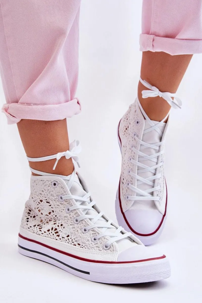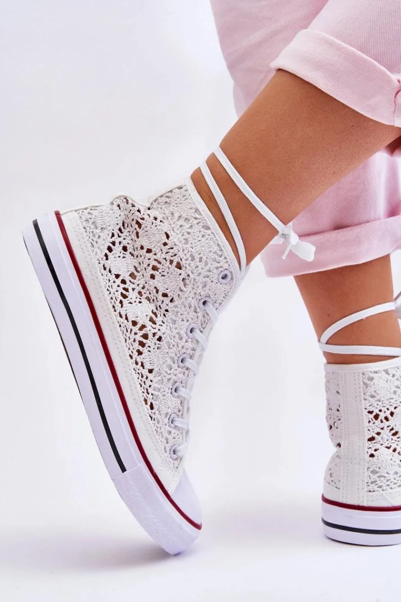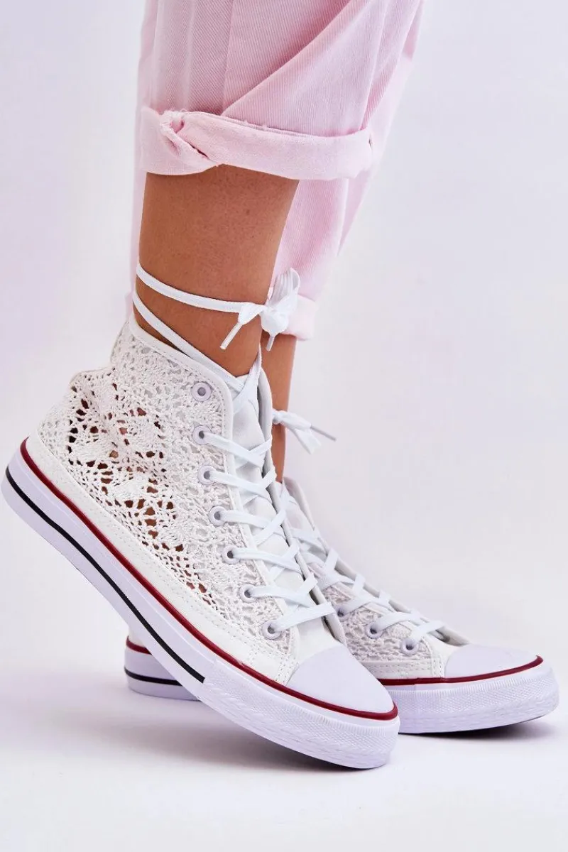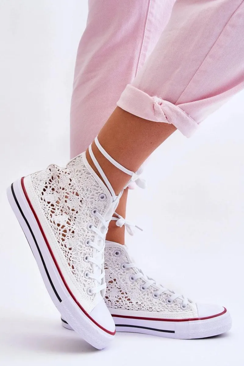 Wysokie trampki damskie zostały wykonane z materiału tekstylnego. Ażurowa cholewka świetnie sprawdzi się w cieplejsze dni, gdyż zapewnia odpowiednią wentylację obuwia. Model posiada klasyczne sznurowanie. Trampki osadzono na platformie z gumową, antypoślizgową podeszwą. Ten model dodatkowo posiada wzmacniany gumowym tworzywem nosek. Przy wyborze rozmiaru prosimy sugerować się tabelą rozmiarów.