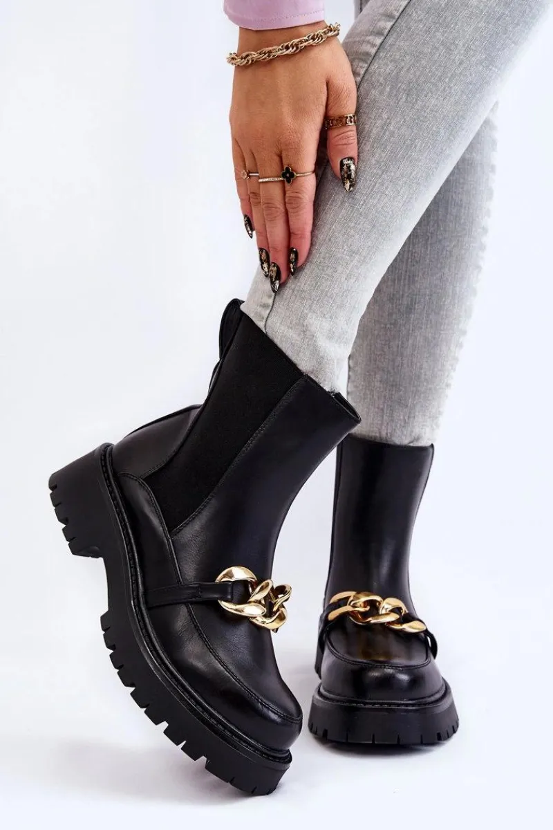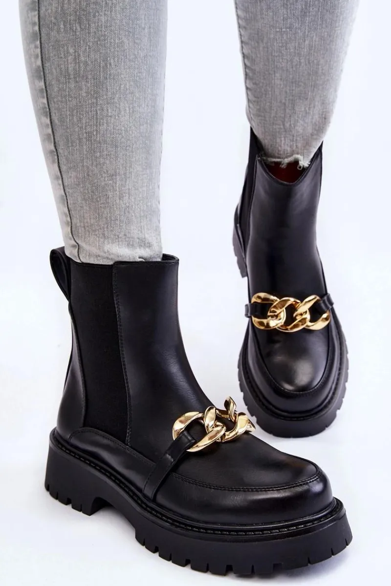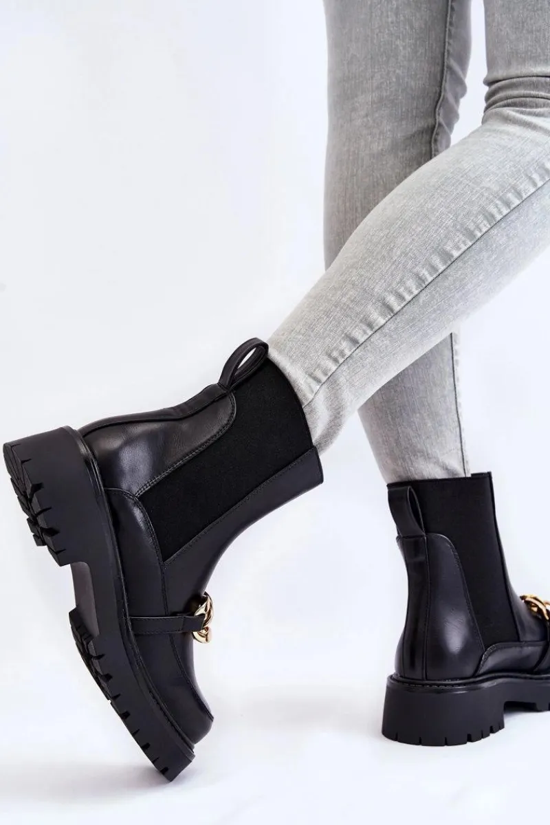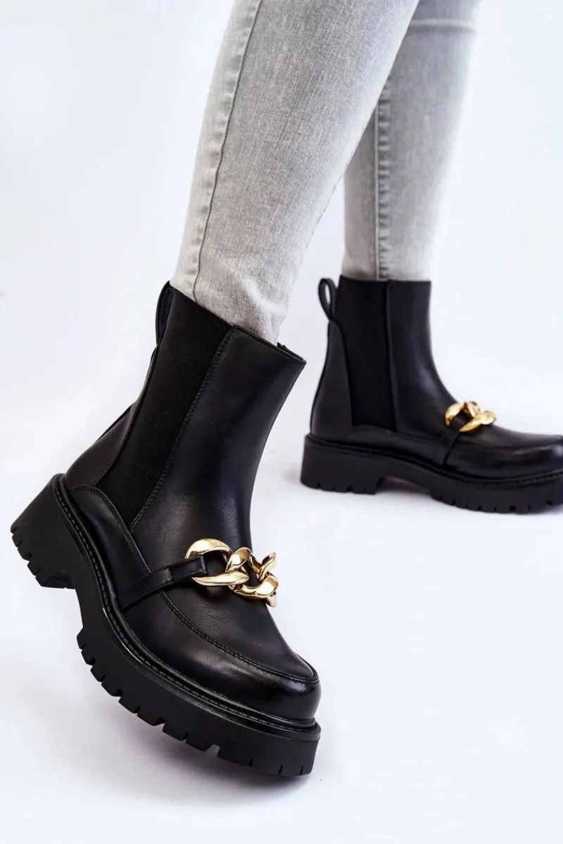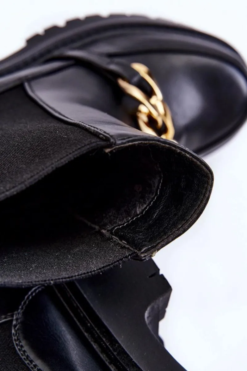 Damskie botki zostały wykonane z połączenia eko skóry oraz elastycznej wstawki. Model klasycznie wsuwany. Sztyblety zostały przyozdobione łańcuchem na przodzie. Botki osadzono na płaskim obcasie ze żłobieniami. Posiadają w środku ocieplenie w postaci delikatnego futerka oraz usztywniany zapiętek. Świetny model do wielu stylizacji! Przy wyborze rozmiaru prosimy sugerować się tabelą rozmiarów.