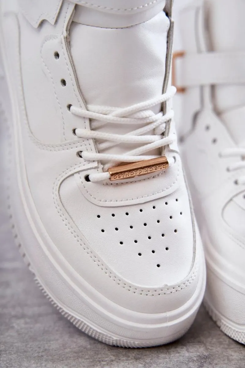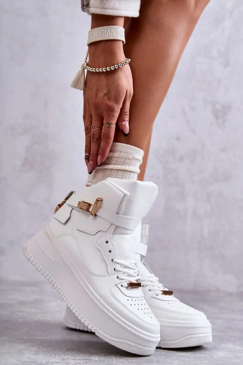 Damskie buty sportowe z wysoką cholewką zostały wykonane z eko skóry z delikatną perforacją na przodzie. Osadzone na masywnej platformie z gumowego tworzywa. Model antypoślizgowy. Buty sportowe są klasycznie sznurowane z dodatkowym paseczkiem na cholewce z zapinką. Z tyłu posiadają ozdobną kłódkę. Środek obuwia jest ocieplany miłym w dotyku kocem obuwniczym. Przy wyborze rozmiaru prosimy kierować się tabelą rozmiarów.