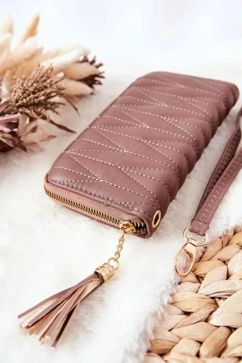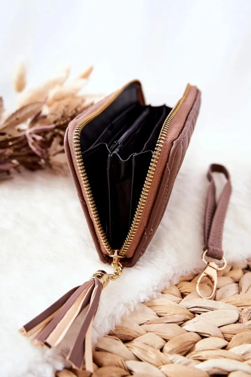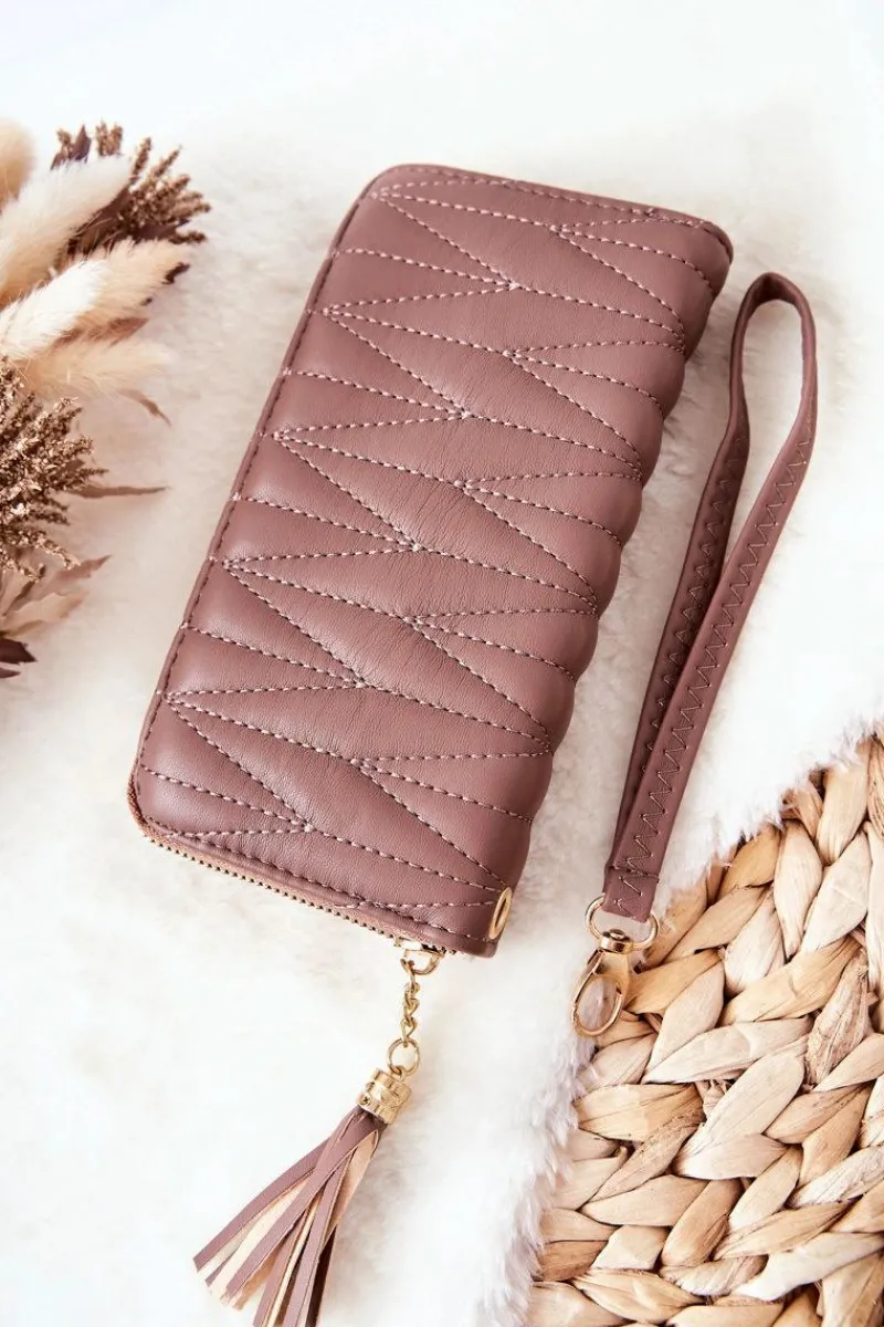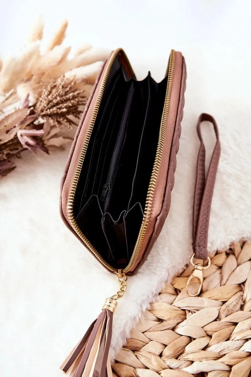 Duży portfel zapinany z zewnątrz na zamek błyskawiczny. Z zewnątrz został wykonany z pikowanej eko skóry. Przy zamku znajduje się frędzelek. Dodatkowo w zestawie jest dołączony paseczek. W środku miejsce na bilony, banknoty oraz wizytówki. Koniecznie sprawdź pozostałe nasze portfele!