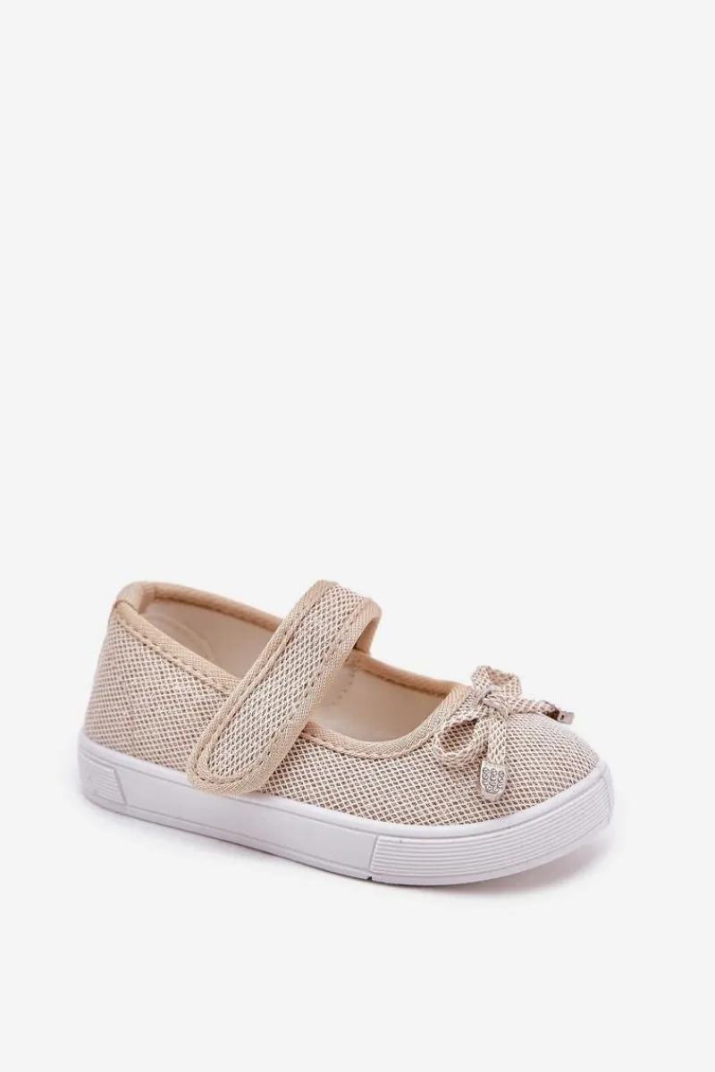 Dziecięce balerinki wykonane z materiału tekstylnego. Dzięki elastycznej podeszwie maluchy mogą swobodnie biegać i bawić się przez cały dzień. Model zapinany na rzep ułatwia zakładanie i zdejmowanie butów, a urocza kokardka z przodu dodaje im dziewczęcego uroku. Zaokrąglone noski i materiałowa wkładka gwarantują komfort i odpowiednią wentylację stóp, czyniąc te balerinki idealnym wyborem na co dzień. Przy wyborze rozmiaru prosimy sugerować się tabelą rozmiarów.