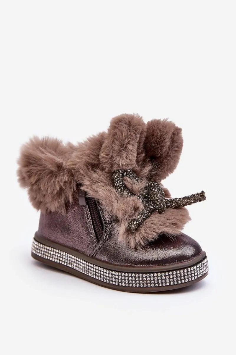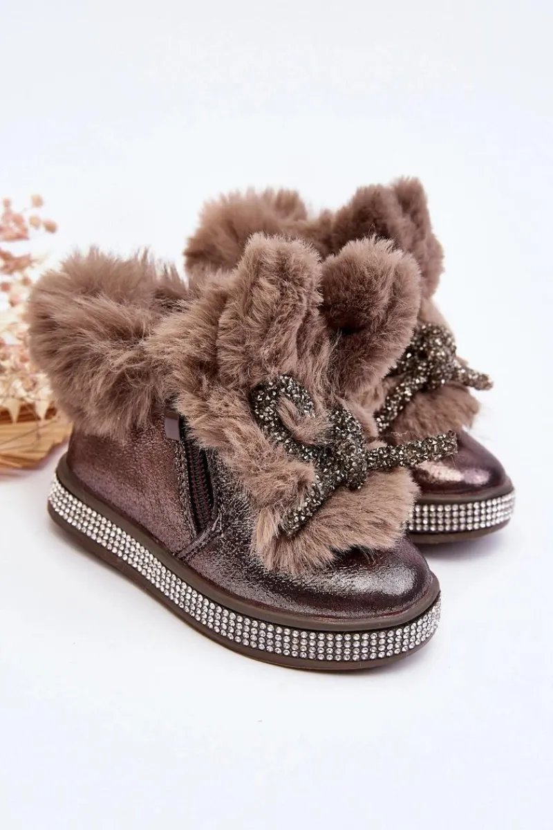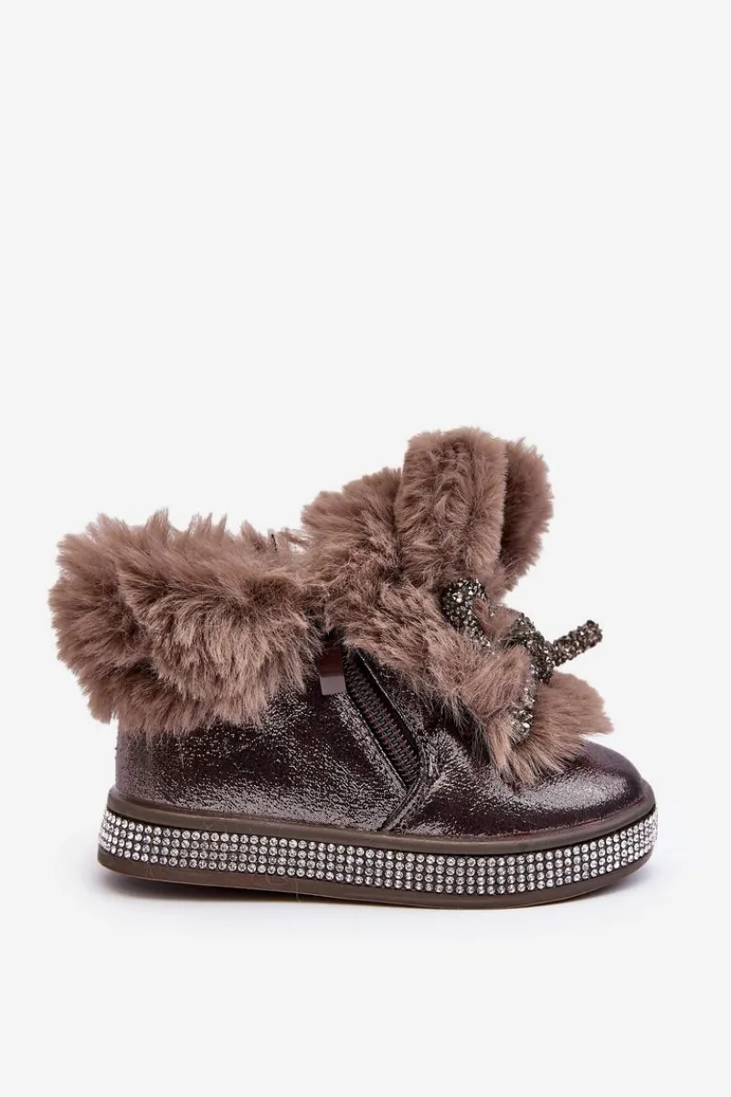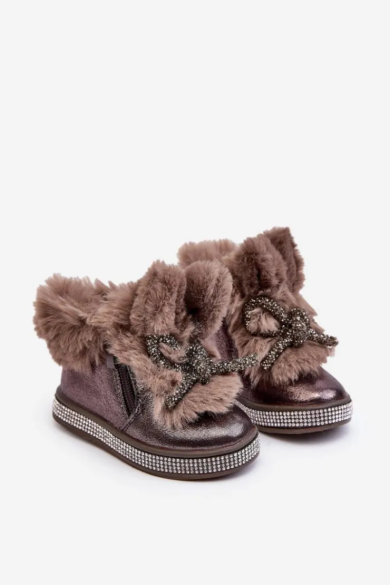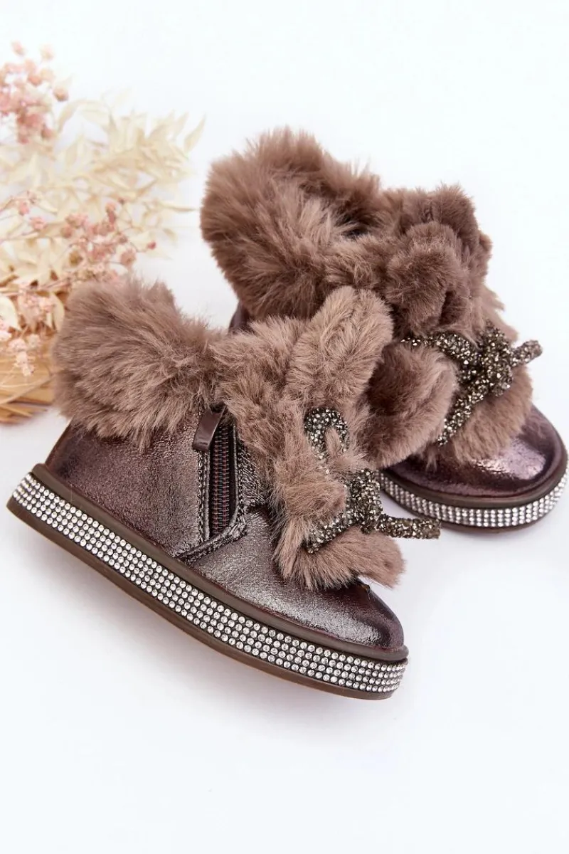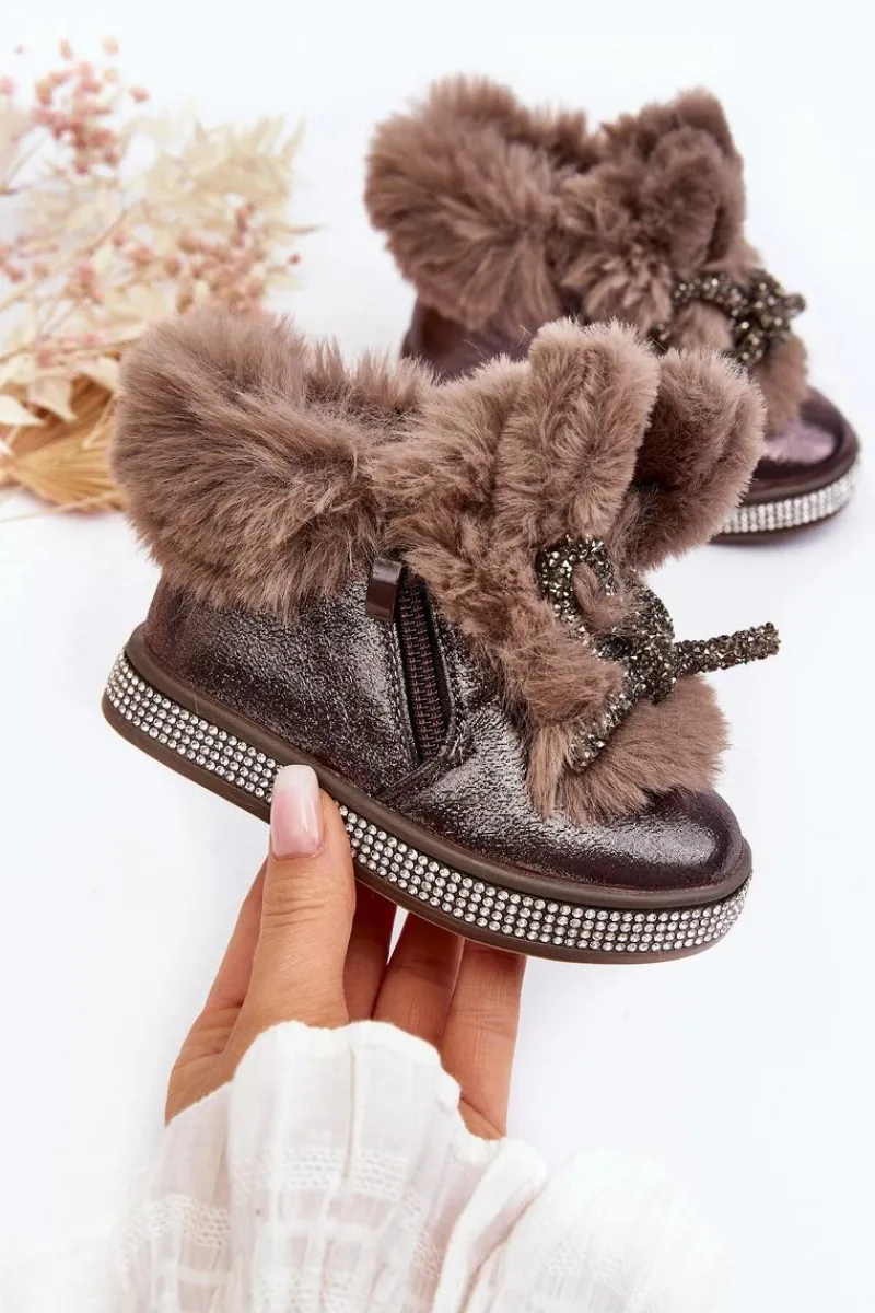 Botki dziecięce wykonane z tworzywa odpornego na przemakanie. Osadzone na platformie. Zapinane na suwak po zewnętrznej stronie. Z przodu futerko. Środek ocieplony kocem obuwniczym. Noski zaokrąglone. Ozdobione małymi, błyszczącymi cyrkoniami. Ten model z pewnością przypadnie do gustu Twojemu dziecku! Przy wyborze rozmiaru prosimy kierować tabelą rozmiarów.