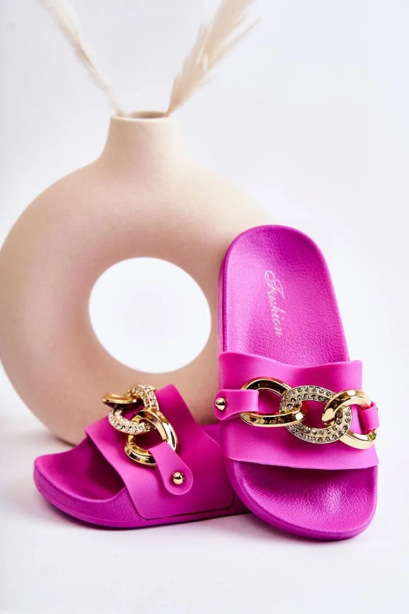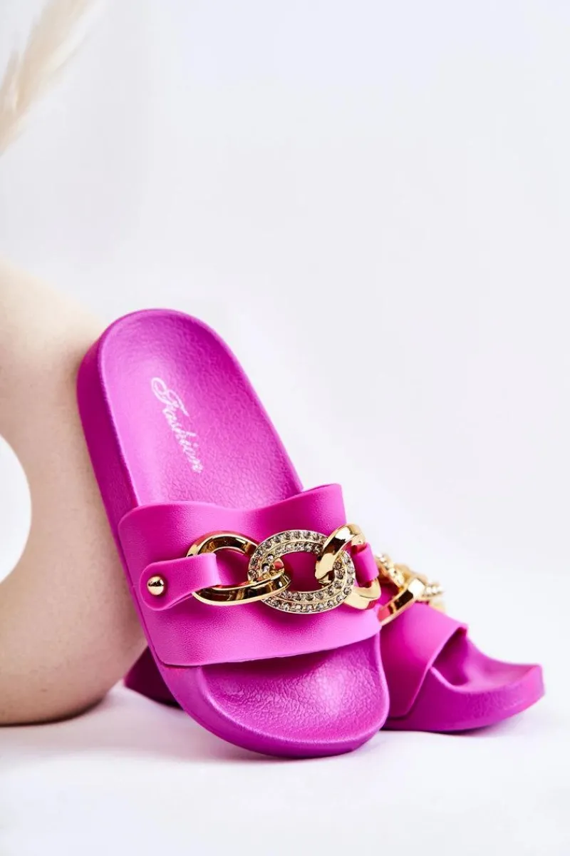 Cudowne dziecięce klapki zostały wykonane z gumowego tworzywa. Model ten posiada na przodzie ozdobny łańcuch wykonany z tworzywa sztucznego. Dodatkowo jest przyozdobiony dżetami imitującymi cyrkonie. Wkładka jest profilowana. Klapki są osadzone na platformie. Nosek odkryty, zaokrąglony. Model klasyczny, wsuwany. Twoja pociecha na pewno będzie zadowolona z tego modelu! Koniecznie sprawdź także pozostałe modele dziecięcych klapek! Przy wyborze rozmiaru prosimy sugerować się tabelą rozmiarów.