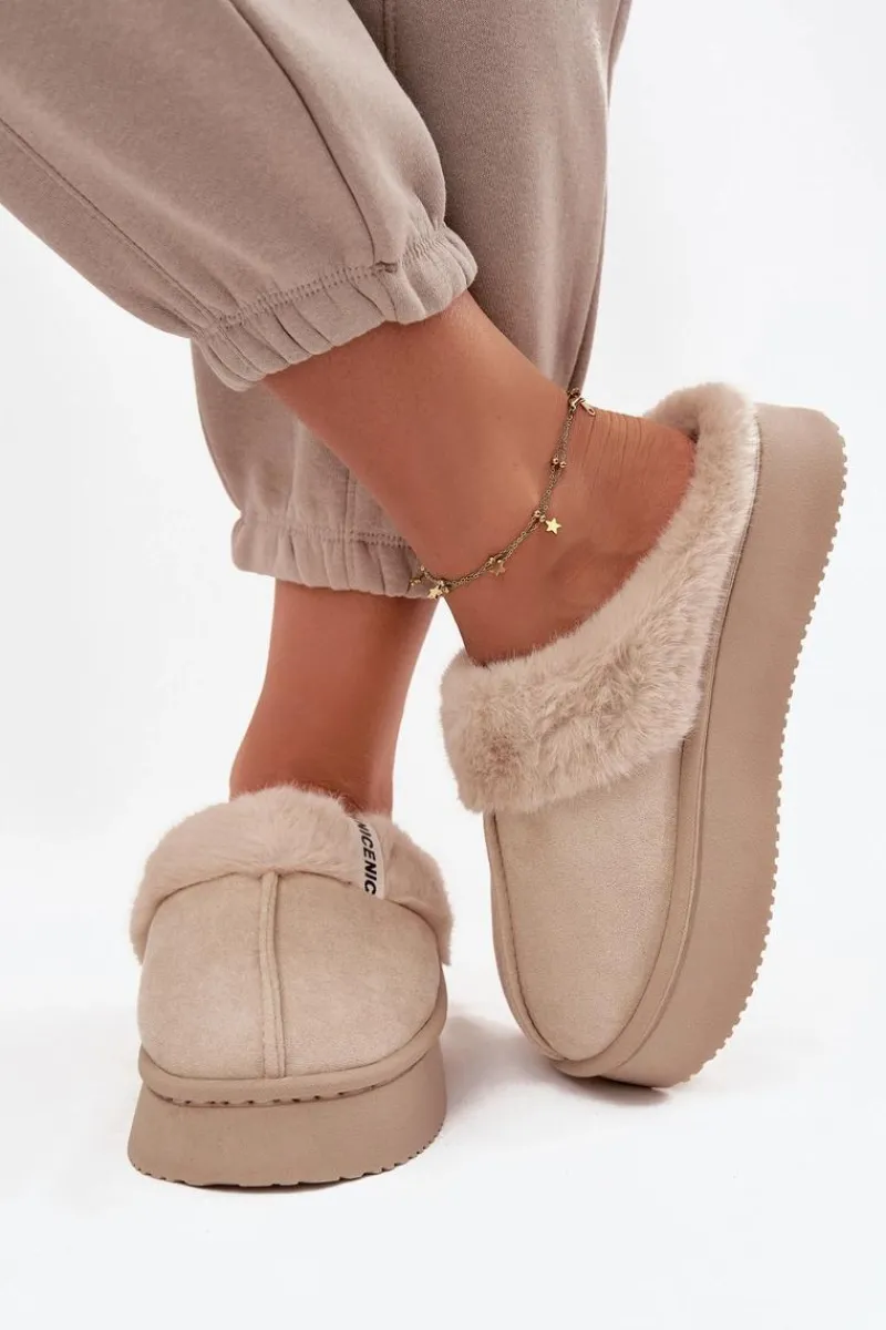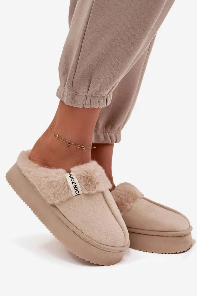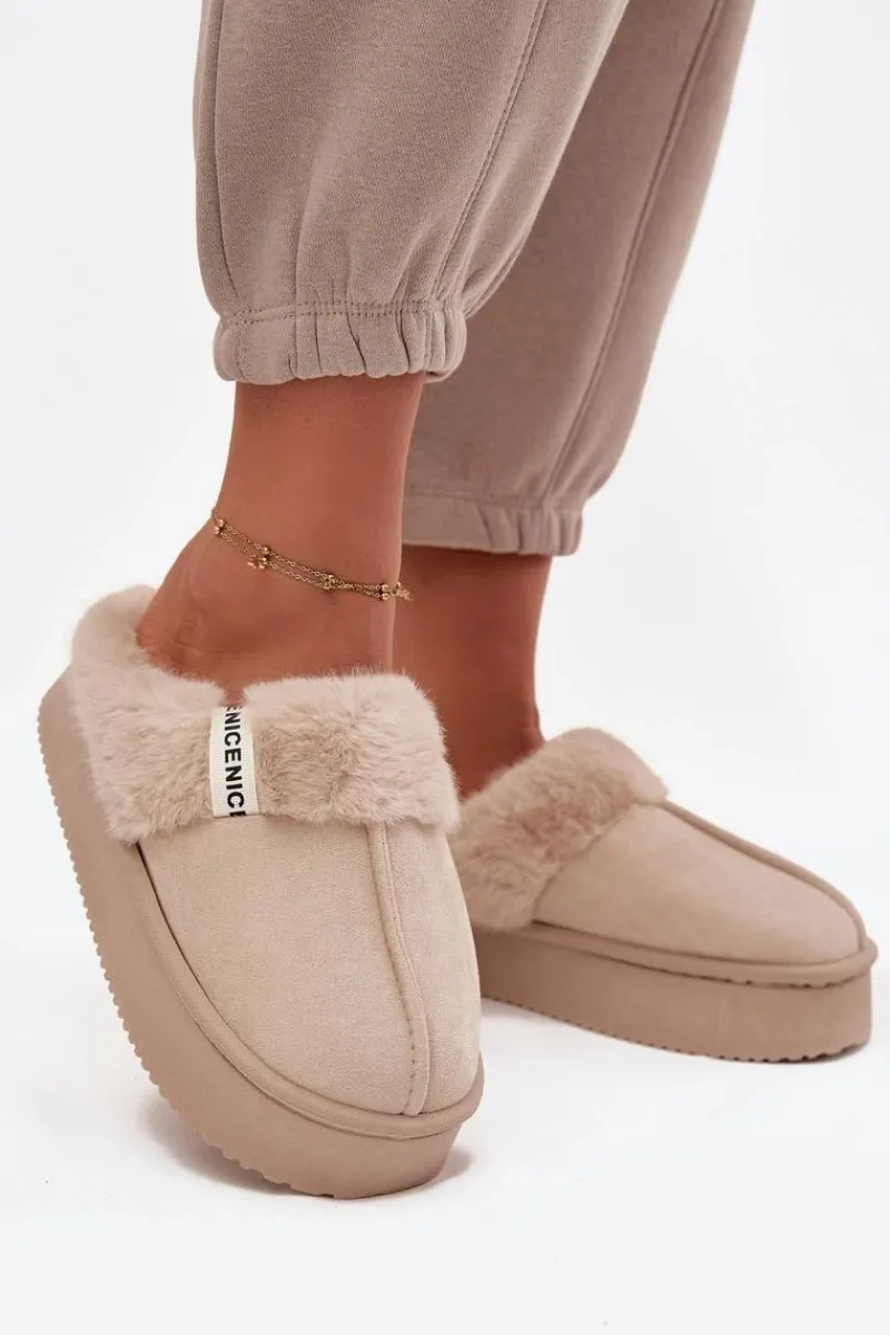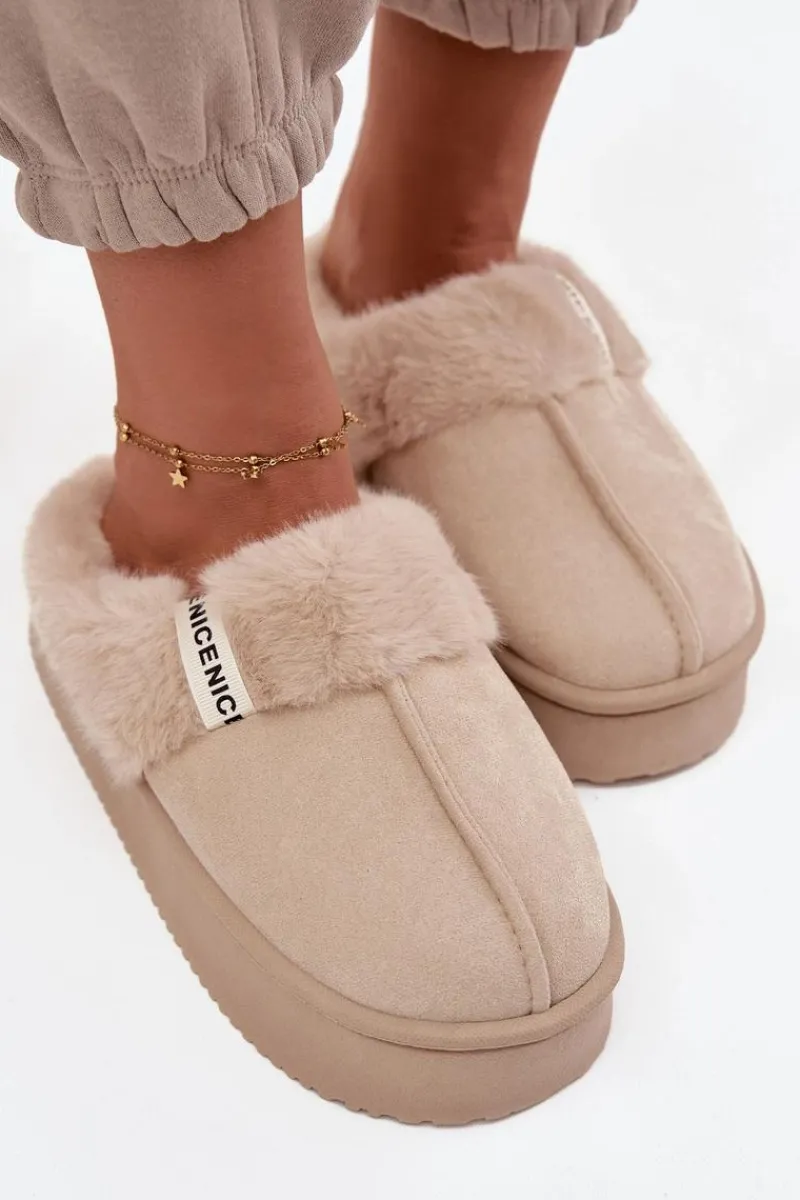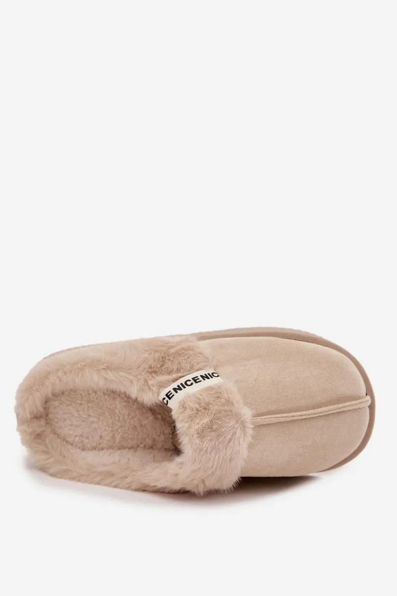 Kapcie damskie wykonane z miękkiej eko zamszowej tkaniny to idealna propozycja dla kobiet ceniących ciepło i wygodę. Model osadzony został na grubej podeszwie, która zapewnia stabilność oraz komfort podczas chodzenia po domu. Górną część ozdobiono przyjemnym w dotyku futerkiem i stylowym paseczkiem z napisem, co nadaje całości modnego i przytulnego charakteru. Wnętrze kapci zostało ocieplone, dzięki czemu doskonale chronią stopy przed chłodem. Przy wyborze rozmiaru prosimy sugerować się tabelą rozmiarów.