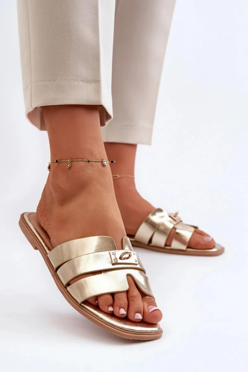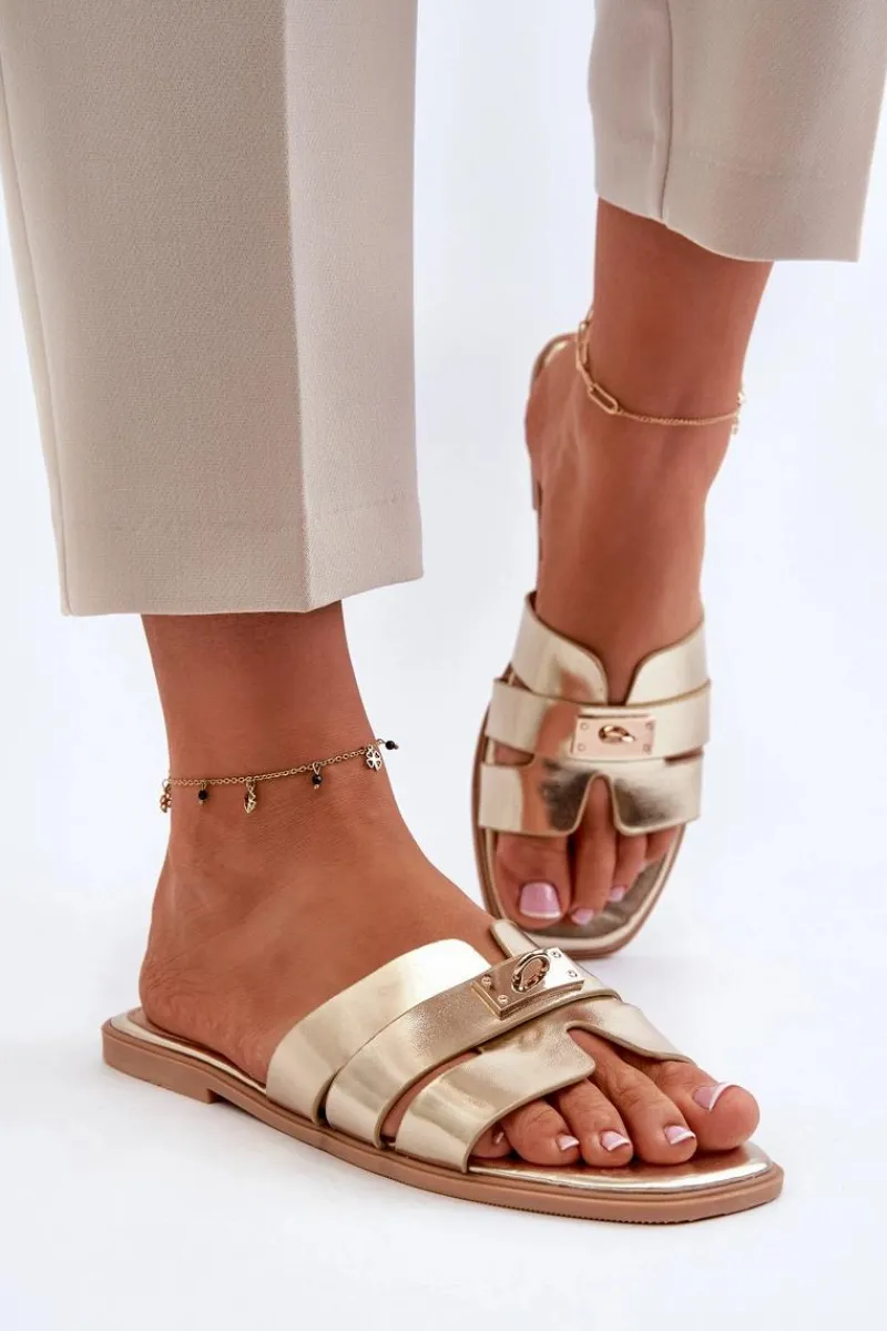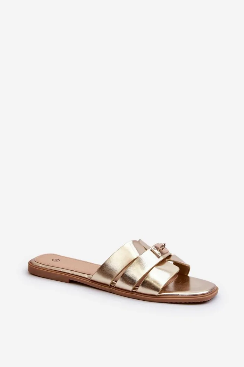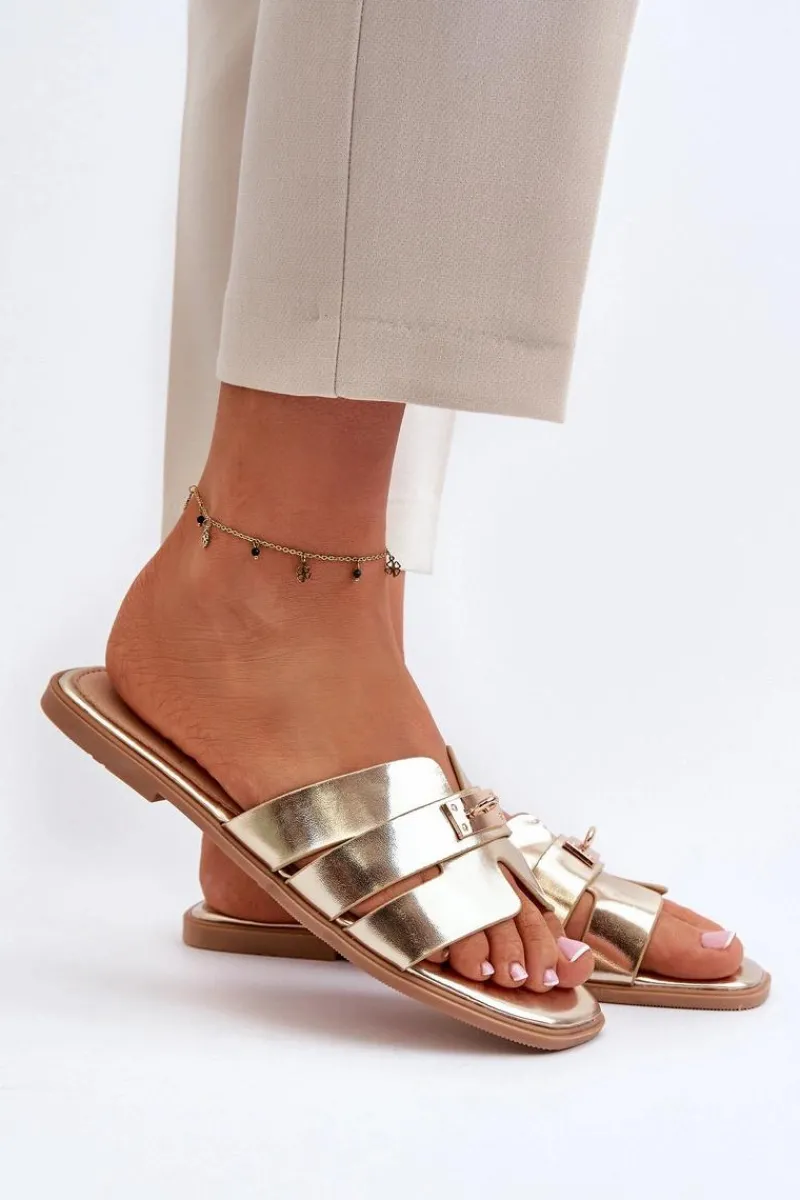 Stylowe i płaskie klapki damskie są idealnym wyborem na upalne dni. Wykonane z eko skóry. Z przodu delikatna złota ozdoba, która dodaje im elegancji i wyjątkowego charakteru. Te klasyczne klapki nie tylko świetnie prezentują się, ale także są komfortowe i praktyczne na co dzień, doskonale uzupełniając letnią garderobę. Przy wyborze rozmiaru prosimy sugerować się tabelą rozmiarów.
