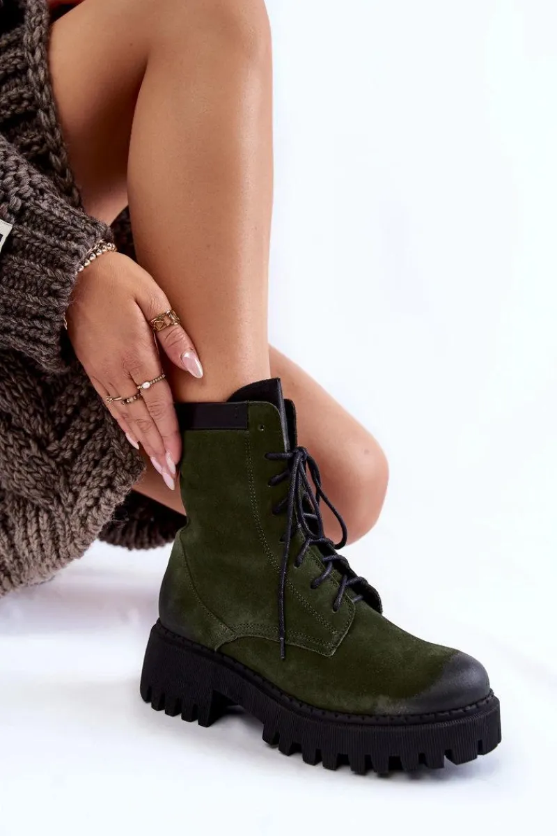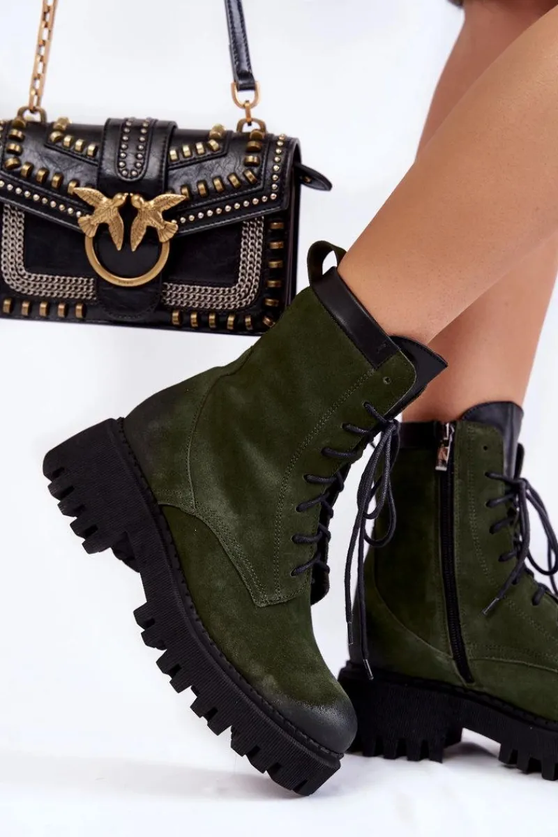 Klasyczne botki damskie zostały wykonane z wysokiej jakości naturalnych skór. Model ten posiada klasyczne sznurowanie oraz suwak z boku cholewki. Modne przetarcia na przodzie oraz tyle buta. Usztywniany zapiętek zapewni stabilizację stopy. Botki zostały ocieplone kocem obuwniczym. Osadzone na płaskim obcasie i platformie ze żłobieniami. Przy wyborze rozmiaru prosimy sugerować się tabelą rozmiarów.