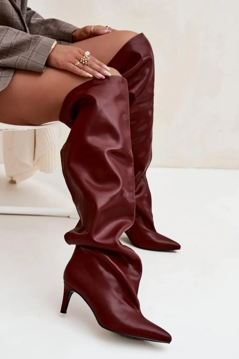 Kozaki Mavilla to propozycja dla kobiet, które cenią sobie elegancję i klasykę w nowoczesnym wydaniu. Wykonane z miękkiego eko zamszu w ciepłym bordowym odcieniu, prezentują się niezwykle stylowo i kobieco. Wysoka cholewka sięgająca za kolano pięknie wydłuża nogi, a smukła linia buta subtelnie podkreśla sylwetkę. To model, który doskonale łączy modny wygląd z wygodą użytkowania.