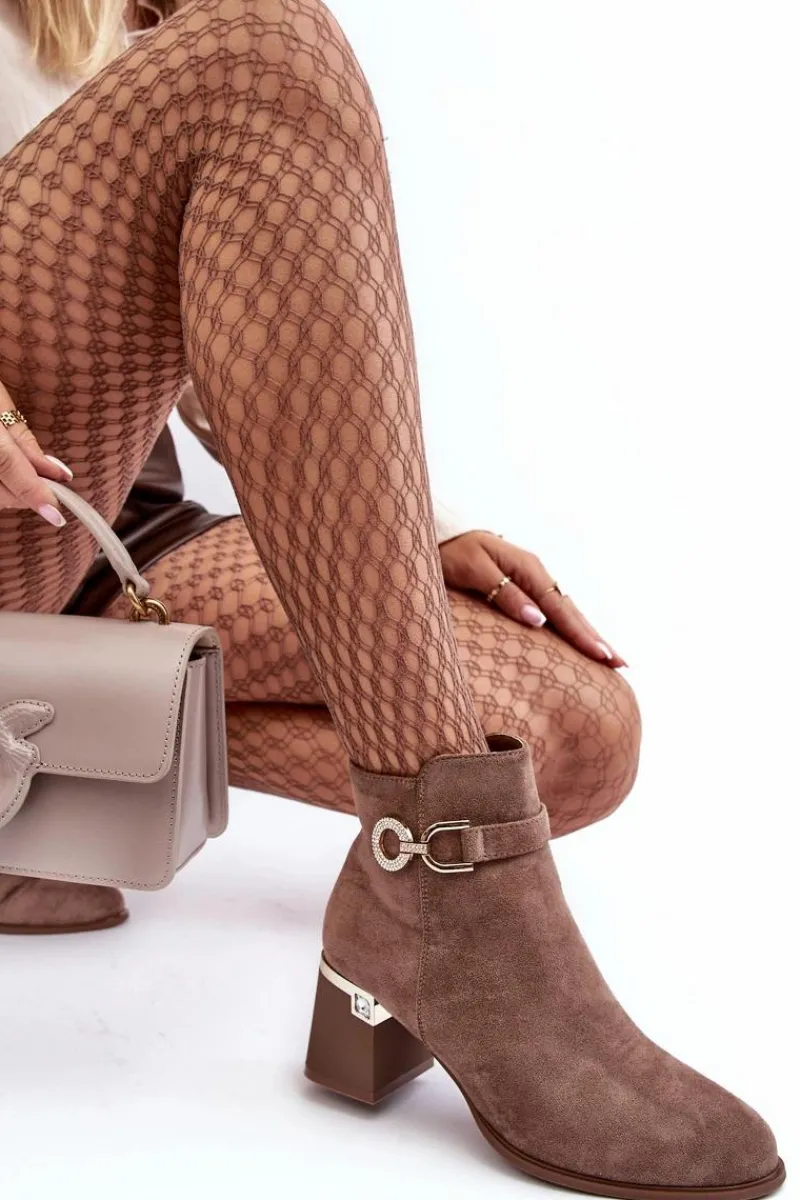 Rewelacyjne, damskie botki zostały osadzone na zdobionym obcasie w postaci słupka. Model ten został wykonany z eko zamszu. Na cholewce z boku umieszczono ozdobę z dżetami, natomiast z drugiej strony suwak ułatwiający zakładanie obuwia. Środek tego botka nie jest ocieplony. Usztywniony zapiętek zapewni stabilizację. Przy wyborze rozmiaru prosimy sugerować się tabelą rozmiarów.