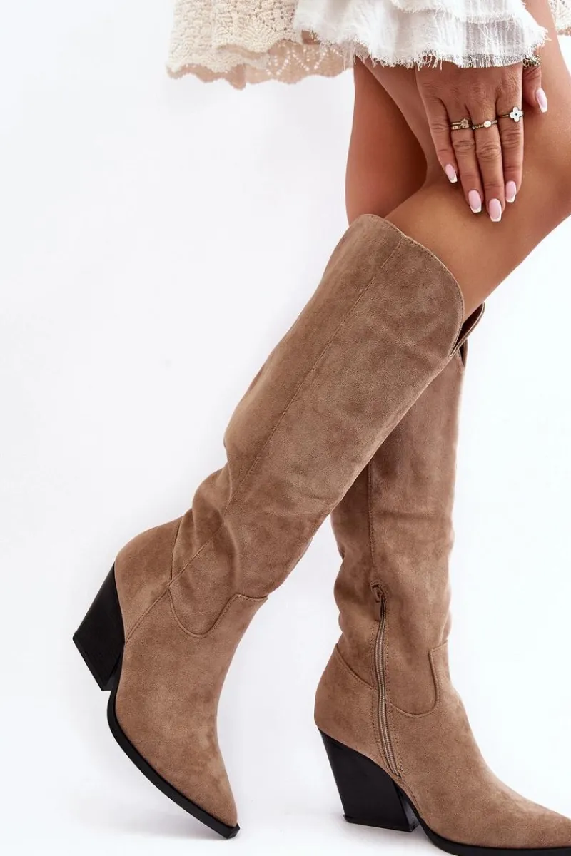 Kozaki damskie zostały wykonane z eko zamszu. Osadzone na obcasie w postaci masywnego słupka. Model ten jest wsuwany i zapinany częściowo na suwak z boku. Zapiętek jest usztywniony. Ten model skradnie serce niejednej miłośniczce kozaków w stylu kowbojek! Koniecznie powinnaś je mieć! Przy wyborze rozmiaru prosimy sugerować się tabelą rozmiarów.