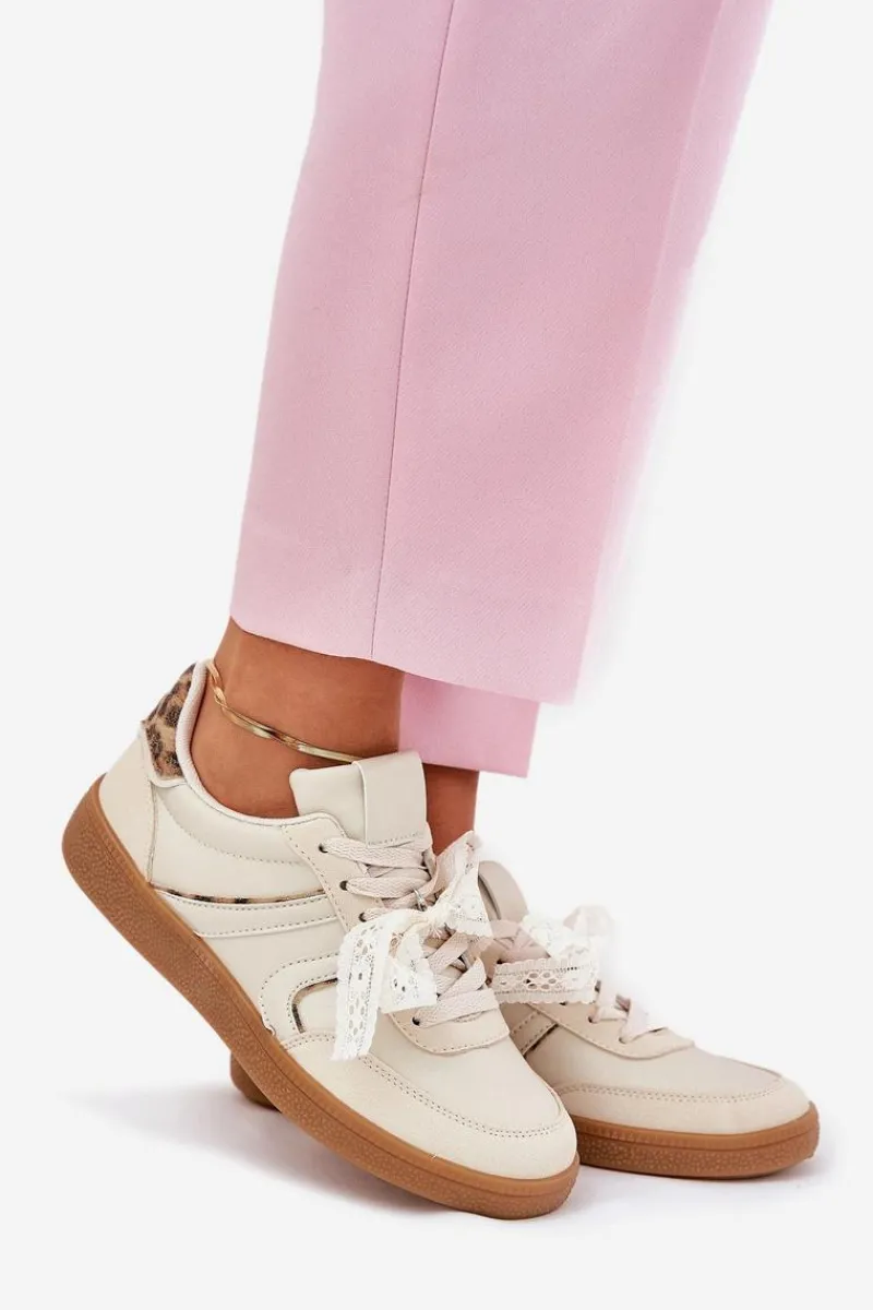 Stylowe sneakersy damskie z eko skóry o niskim fasonie, które łączą komfort z modnym wyglądem. Wyjmowana piankowa wkładka, pokryta materiałem, zapewnia wygodę i odpowiednią amortyzację przez cały dzień. Na sznurowaniu znajduje się koronka, którą można odpiąć, dając możliwość dostosowania wyglądu do własnych preferencji. Doskonałe do codziennych stylizacji, te sneakersy wyróżniają się unikalnym wyglądem. Przy wyborze rozmiaru prosimy kierować tabelą rozmiarów.