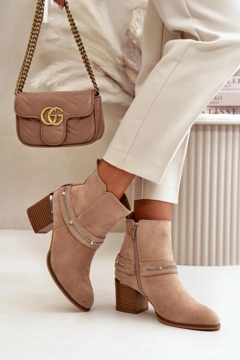 Botki z eko zamszu na obcasie w formie słupka to stylowy wybór na chłodniejsze dni. Cholewka ozdobiona łańcuszkiem dodaje charakteru i wyrazistości. Zapięcie na zamek ułatwia zakładanie i zdejmowanie, a ocieplone wnętrze z koca obuwniczego zapewnia ciepło i komfort. Idealne na jesienne i zimowe stylizacje, te botki łączą w sobie modny wygląd i wygodę noszenia.Przy wyborze rozmiaru prosimy sugerować się tabelą rozmiarów.