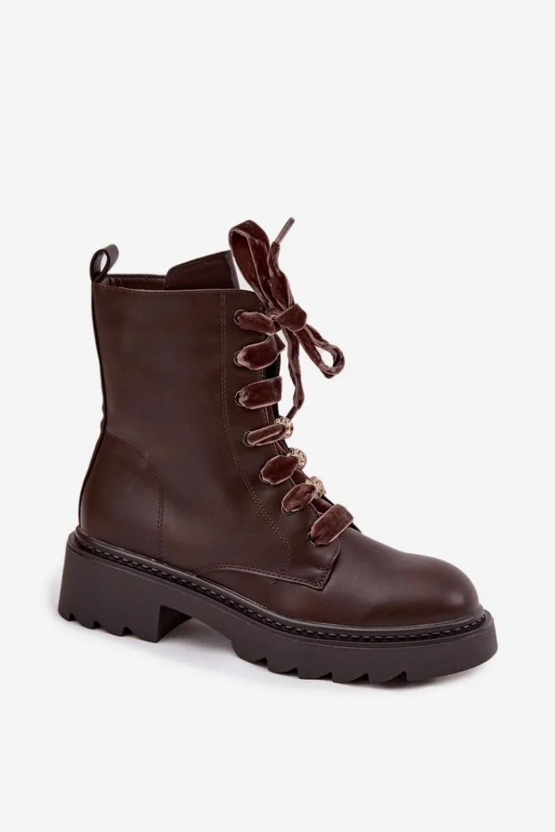 Botki damskie wykonane z eko skóry to propozycja, która łączy elegancję z nowoczesnym stylem. Wnętrze ocieplane miękkim kocem obuwniczym zapewnia ciepło i wygodę w chłodniejsze dni. Model wyróżnia się efektownym sznurowaniem z aksamitnego materiału, które wyjątkowego uroku. Całość dopełniają ozdobne przypinki, dodające modnego akcentu. To stylowe botki idealne do jesienno-zimowych stylizacji.Przy wyborze rozmiaru prosimy sugerować się tabelą rozmiarów.
