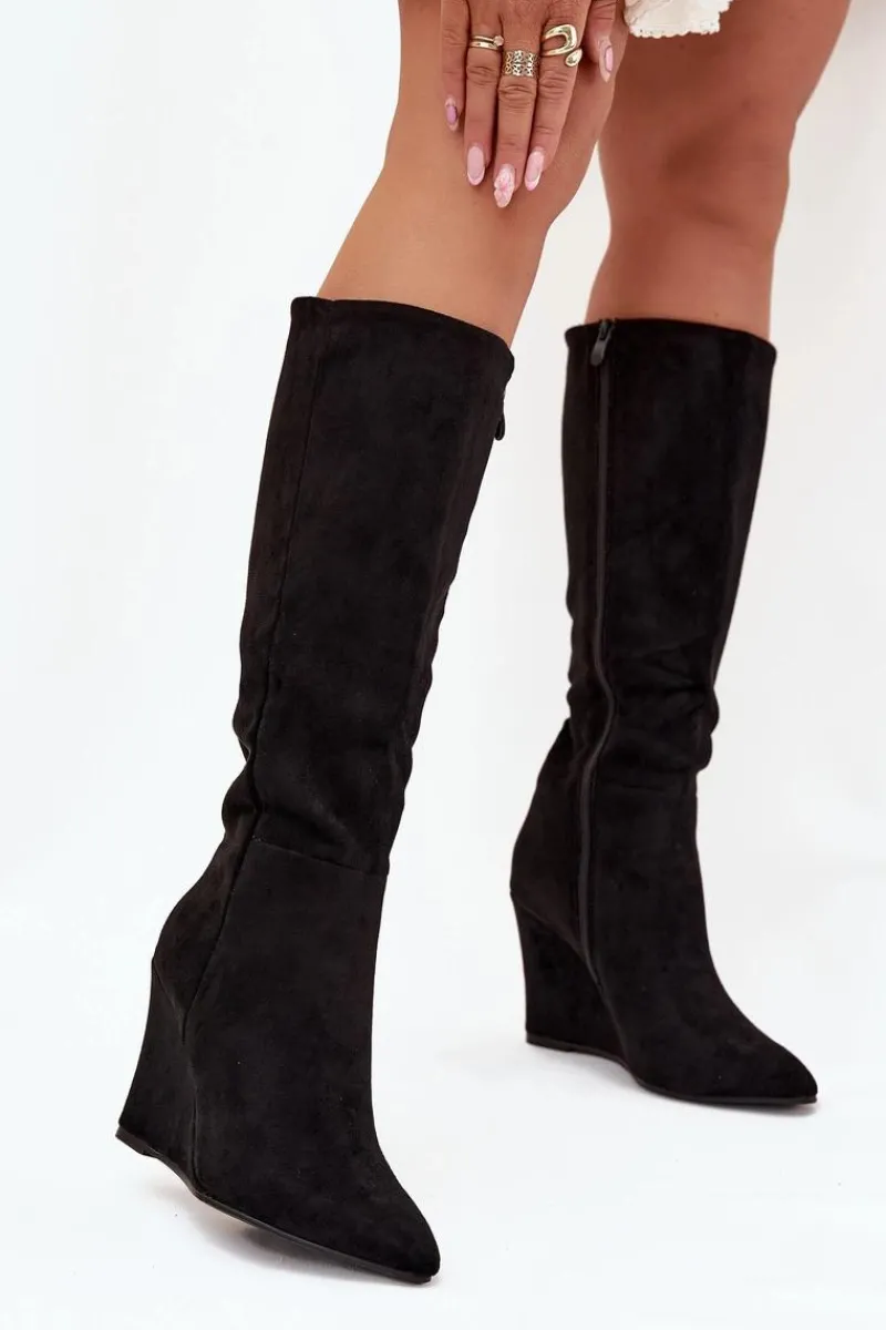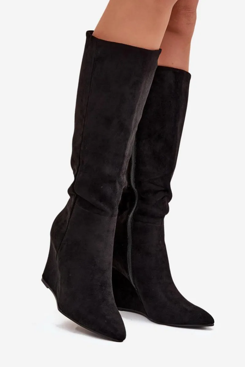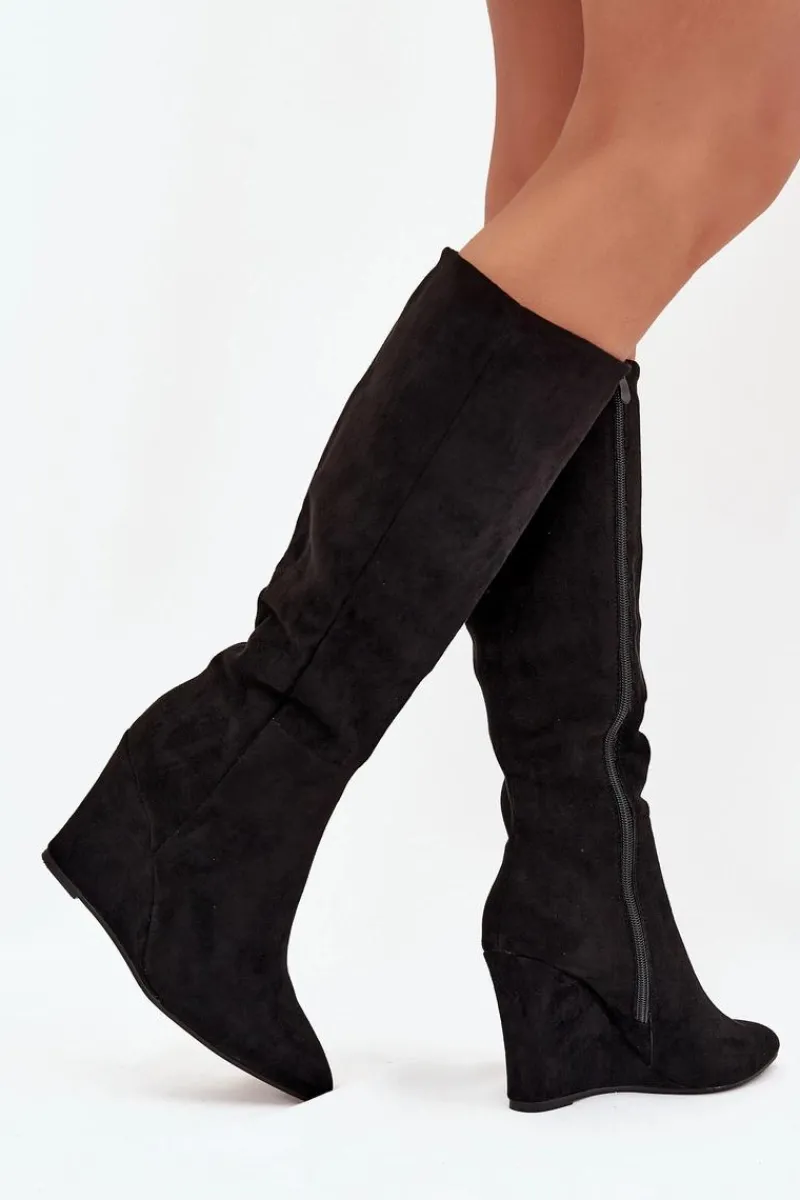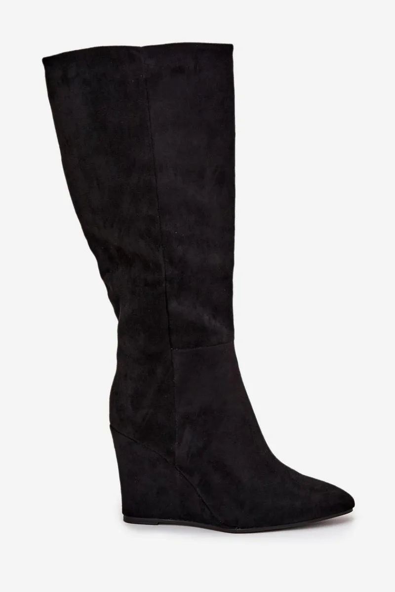 Kozaki damskie z eko zamszu, osadzone na koturnie, łączą elegancję z komfortem. Zapinane na zamek, zapewniają łatwość zakładania, a ocieplenie kocem obuwniczym gwarantuje ciepło w chłodniejsze dni. Cholewka sięgająca przed kolano nadaje im klasyczny wygląd, a noski w migdałowym kształcie dodają subtelności. Idealne do zimowych stylizacji, te kozaki świetnie komponują się z sukienkami oraz spódnicami. Przy wyborze rozmiaru prosimy sugerować się tabelą rozmiarów.