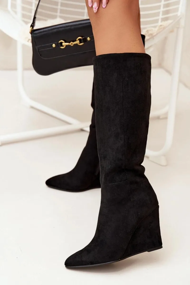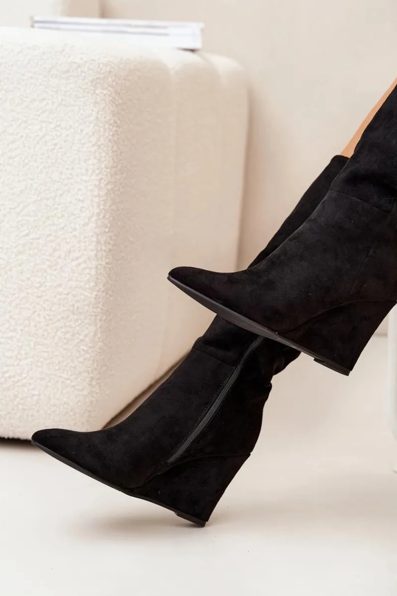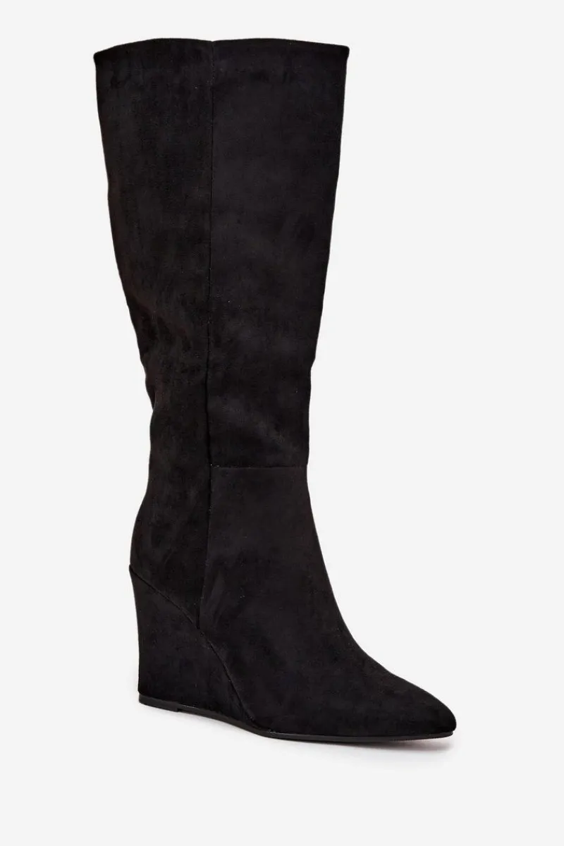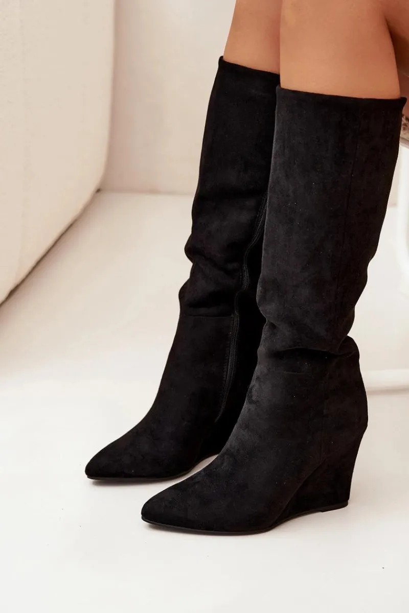 Kozaki damskie z eko zamszu, osadzone na koturnie, łączą elegancję z komfortem. Zapinane na zamek, zapewniają łatwość zakładania, a ocieplenie kocem obuwniczym gwarantuje ciepło w chłodniejsze dni. Cholewka sięgająca przed kolano nadaje im klasyczny wygląd, a noski w migdałowym kształcie dodają subtelności. Idealne do zimowych stylizacji, te kozaki świetnie komponują się z sukienkami oraz spódnicami. Przy wyborze rozmiaru prosimy sugerować się tabelą rozmiarów.