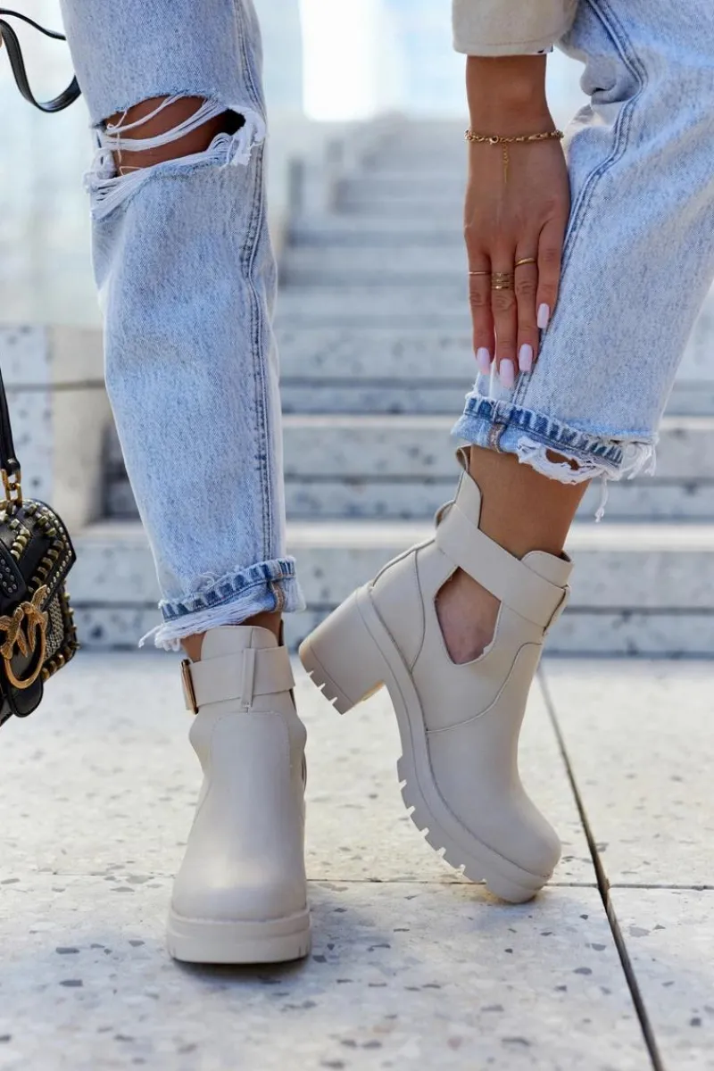 Boto Skórzane Botki Wycięcie Pasek Beżowe Rosanne