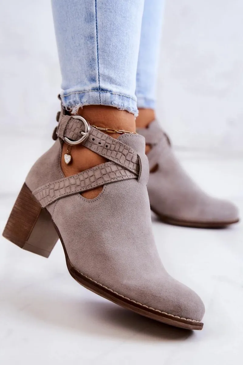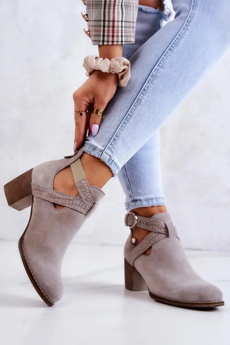 Botki wykonane z naturalnej zamszowej skóry z wycięciami po bokach cholewki. Wkładka wykonana z naturalnej skóry, co sprawia, że są bardzo komfortowe podczas użytkowania. Z boku cholewki znajduje się także regulowany pasek zapinany na sprzączkę oraz gumka. Obcas w postaci słupka. Tłoczona faktura oraz modny fason sprawiają, że te buty wyglądają naprawdę wyjątkowo. Nosek zamknięty, zaokrąglony. Koniecznie sprawdź także pozostałe modele skórzanych butów dostępnych w naszej ofercie! Przy wyborze rozmiaru prosimy sugerować się tabelą rozmiarów.