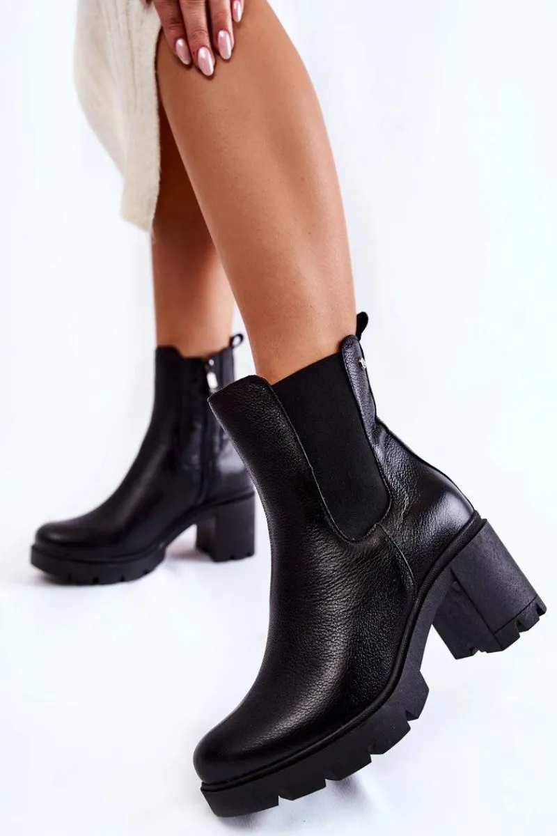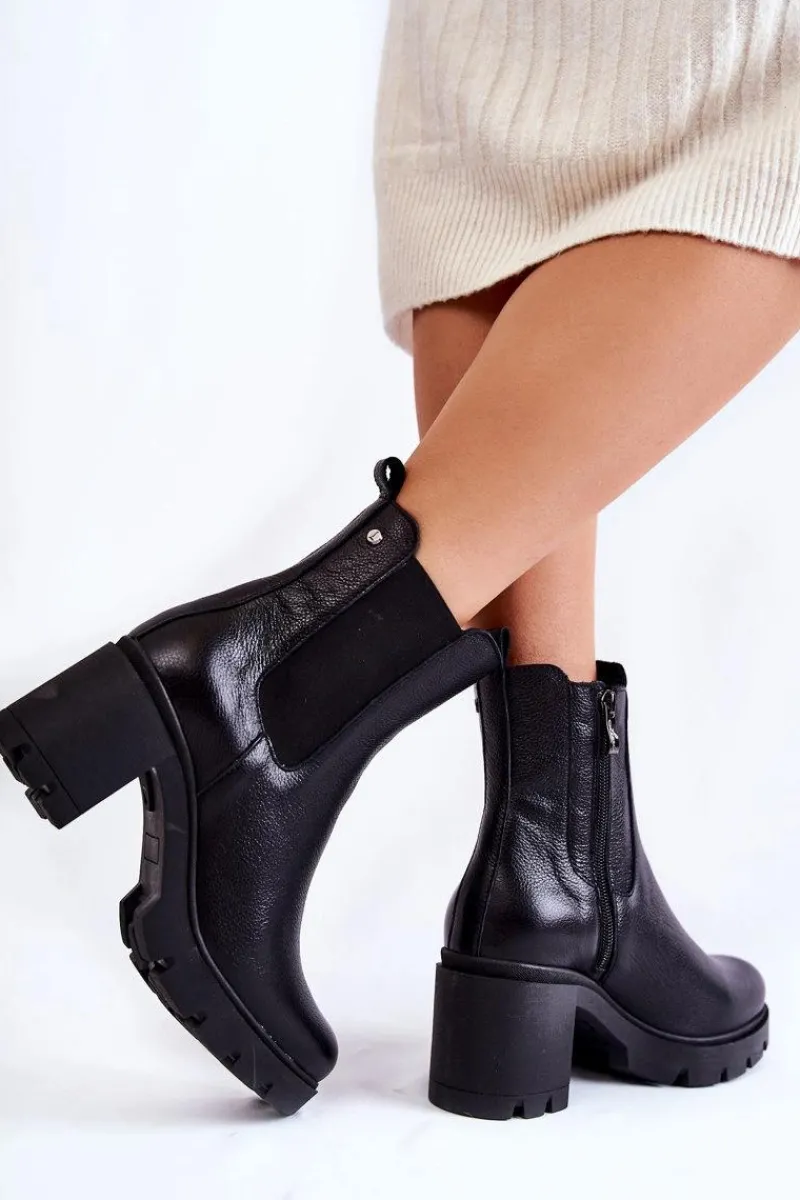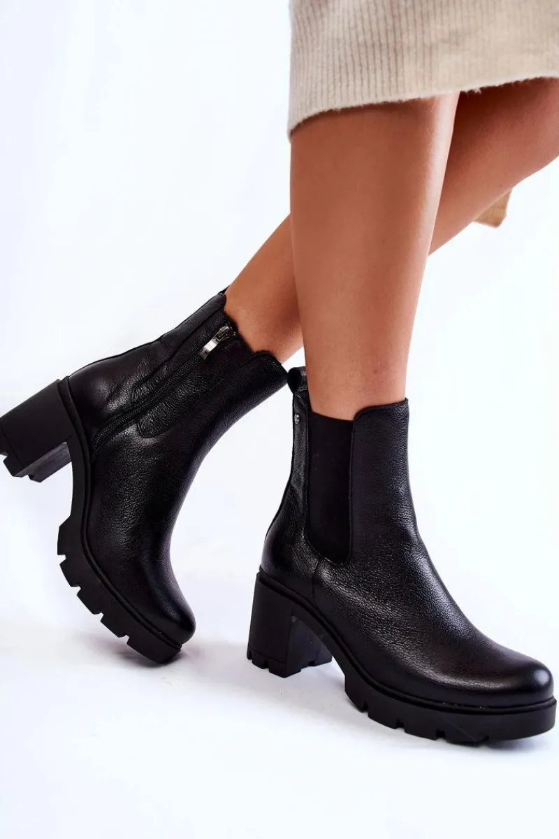 Botki na masywnej platformie z szerokim obcasem w stylu sztybletów. Posiadają wysoką, sięgającą ponad kostkę cholewkę. Wykonane ze skóry naturalnej. Posiadają dodatkową, elastyczną wstawkę, dzięki której cholewka świetnie dopasuje się do tęgości nogi. Buty zostały ocieplone kocem obuwniczym. Botki doskonale sprawdzą się w jesiennych stylizacjach. Przy wyborze rozmiaru prosimy kierować się tabelą rozmiarów