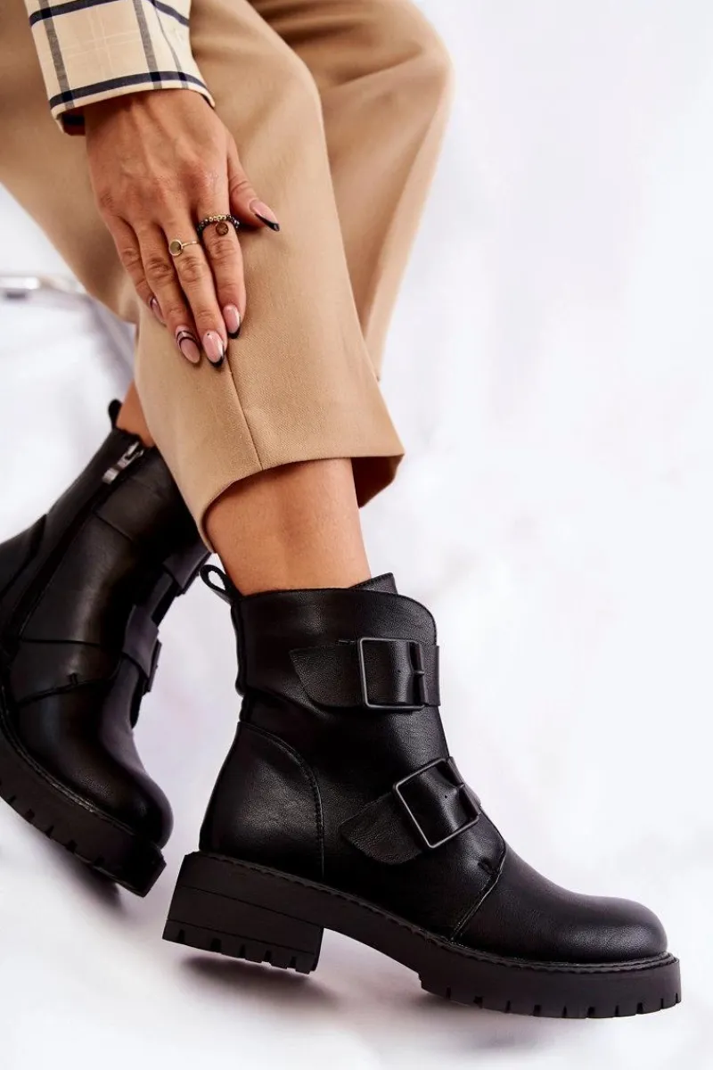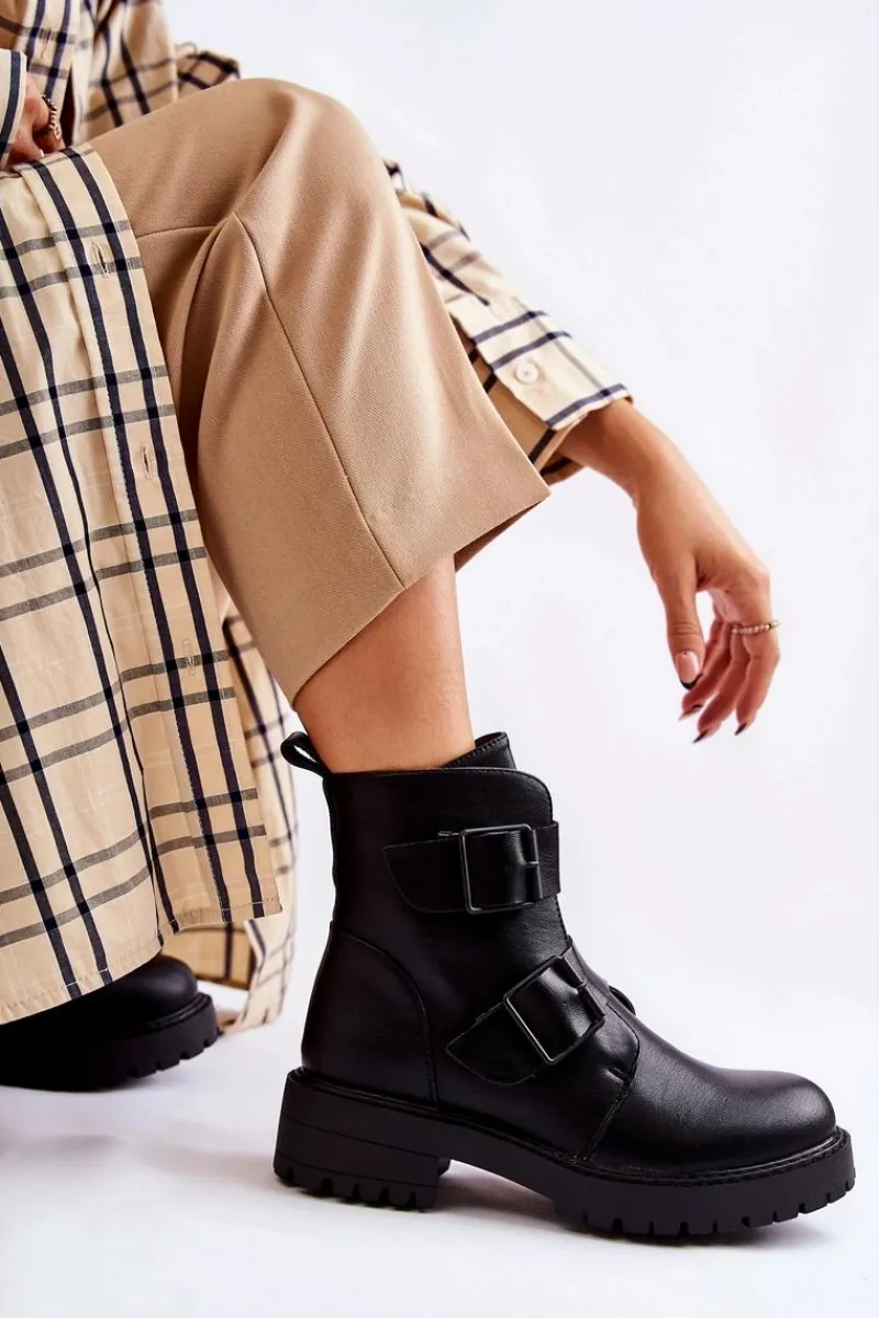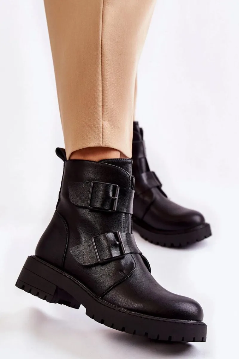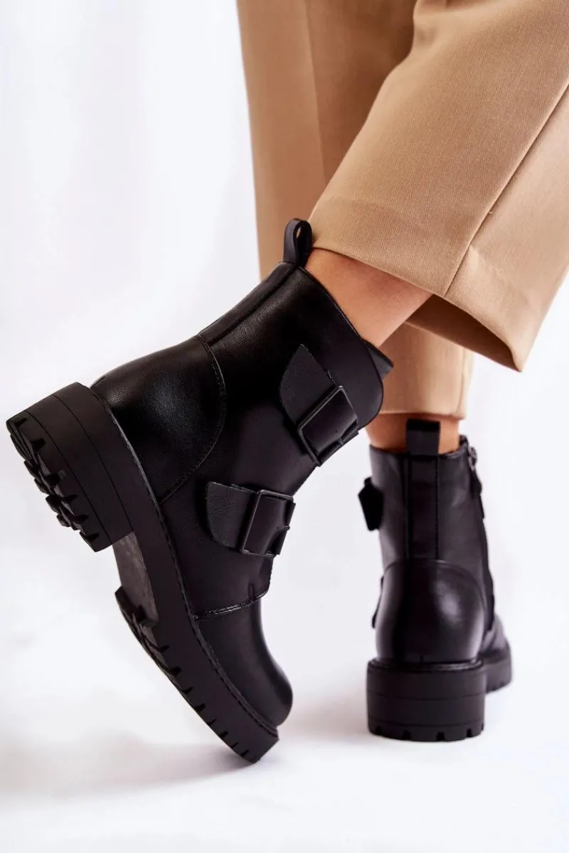 Klasyczne botki damskie zostały wykonane z eko skóry. Posiadają ozdobne paski z klamrami na boku cholewki. Model zapinany na suwak. Osadzone na płaskim obcasie oraz platformie wraz ze żłobieniem. Botki są ocieplane w środku kocem obuwniczym. Posiadają usztywniany zapiętek. Modne obuwie, które świetnie sprawdzi się do pracy, szkoły. Przy wyborze rozmiaru prosimy sugerować się tabelą rozmiarów.