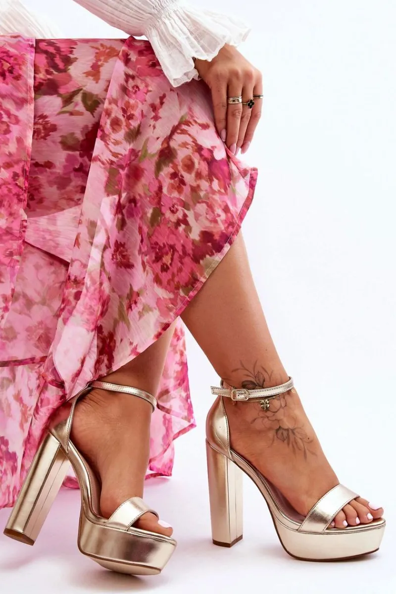 Damskie sandałki zostały wykonane z eko skóry. Model ten posiada na przodzie pasek przytrzymujący stopę przed przesuwaniem. Sandałki osadzono na obcasie w postaci wysokiego słupka oraz platformie. Dodatkowo sandałki posiadają usztywniany zapiętek. Model ten jest zapinany na regulowany pasek ze sprzączką. Przy wyborze rozmiaru prosimy sugerować się tabelą rozmiarów.