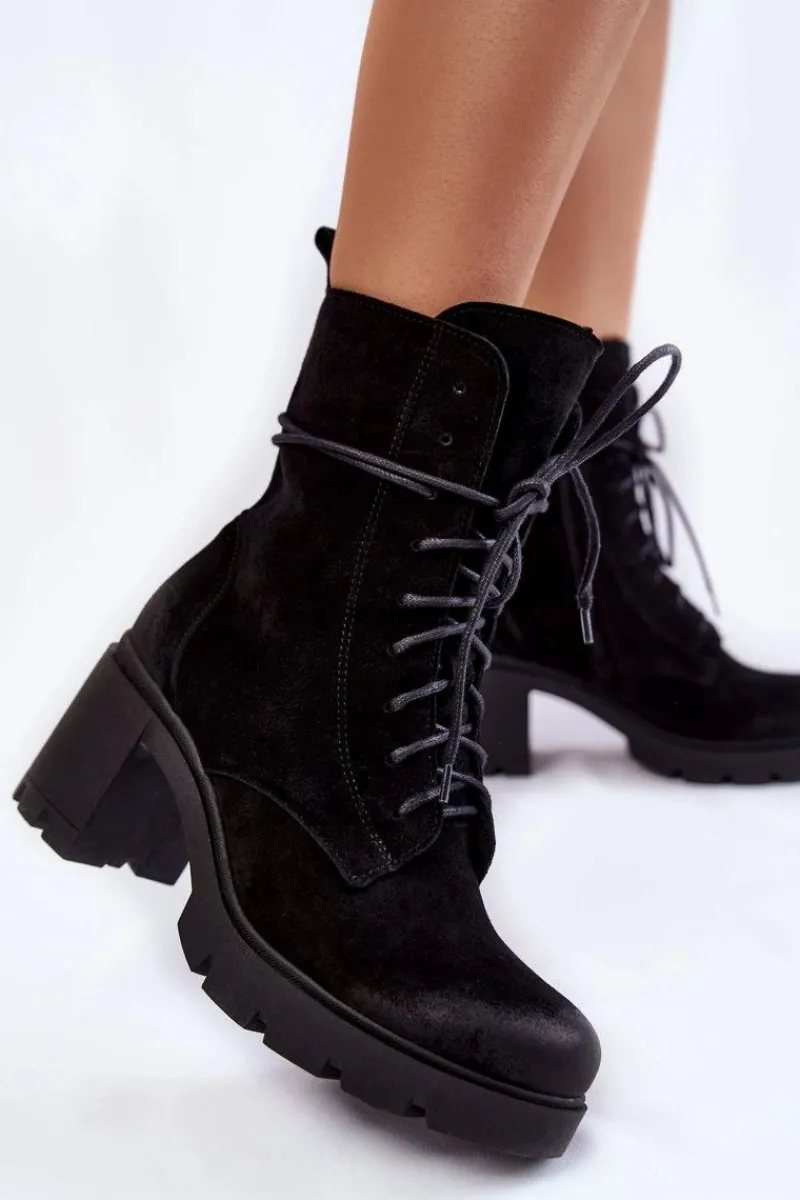 Damskie botki osadzono na masywnej platformie z szerokim obcasem w postaci słupka. Posiadają wysoką, sięgającą ponad kostkę cholewkę. Wykonane z naturalnych skór wysokiej jakości. Buty zostały ocieplone kocem obuwniczym. Model z solidnym sznurowaniem. Dodatkowo zamykane na suwak. Botki doskonale sprawdzą się w jesiennych stylizacjach. Przy wyborze rozmiaru prosimy kierować się tabelą rozmiarów