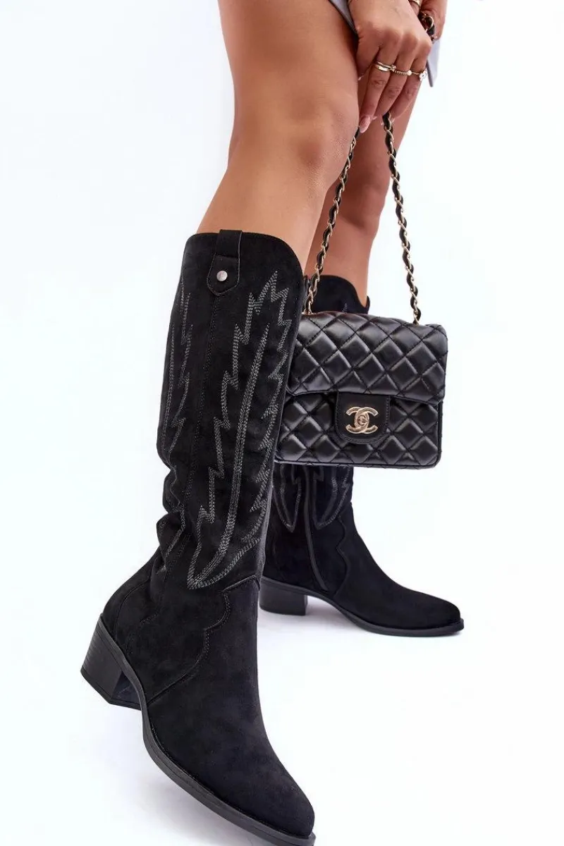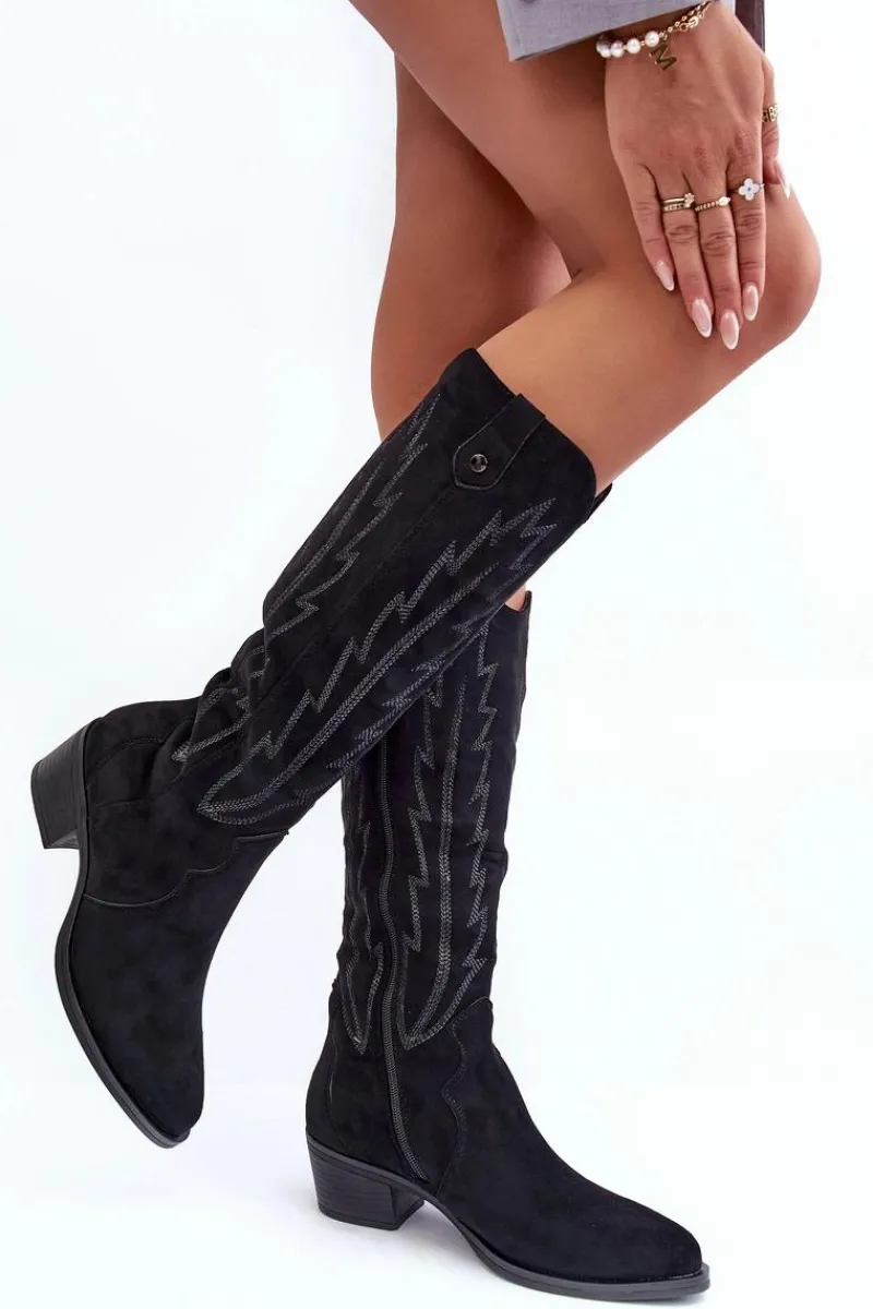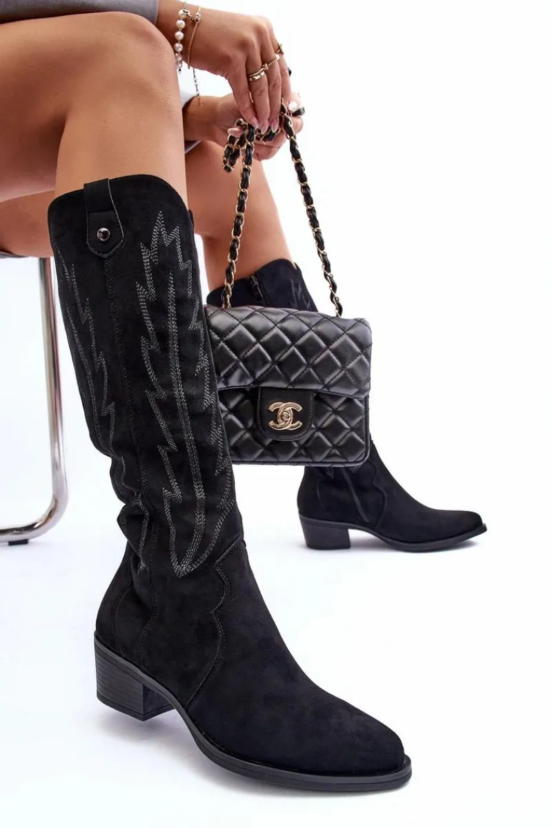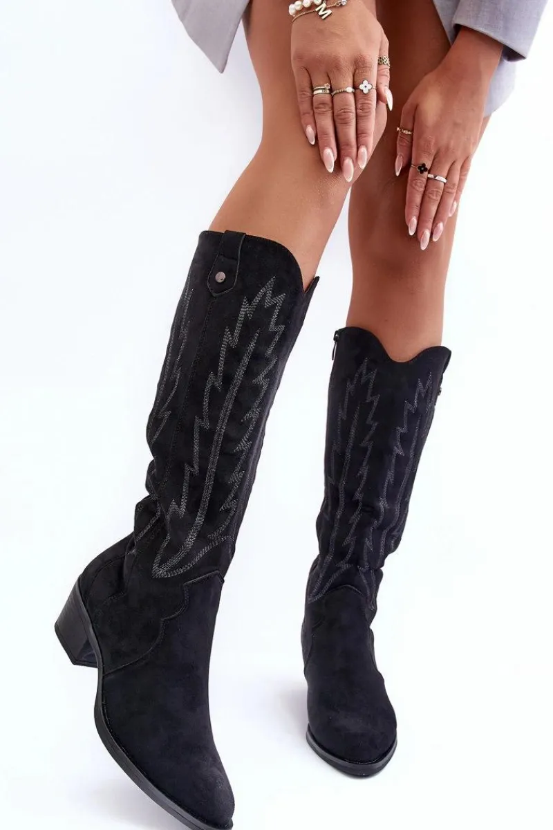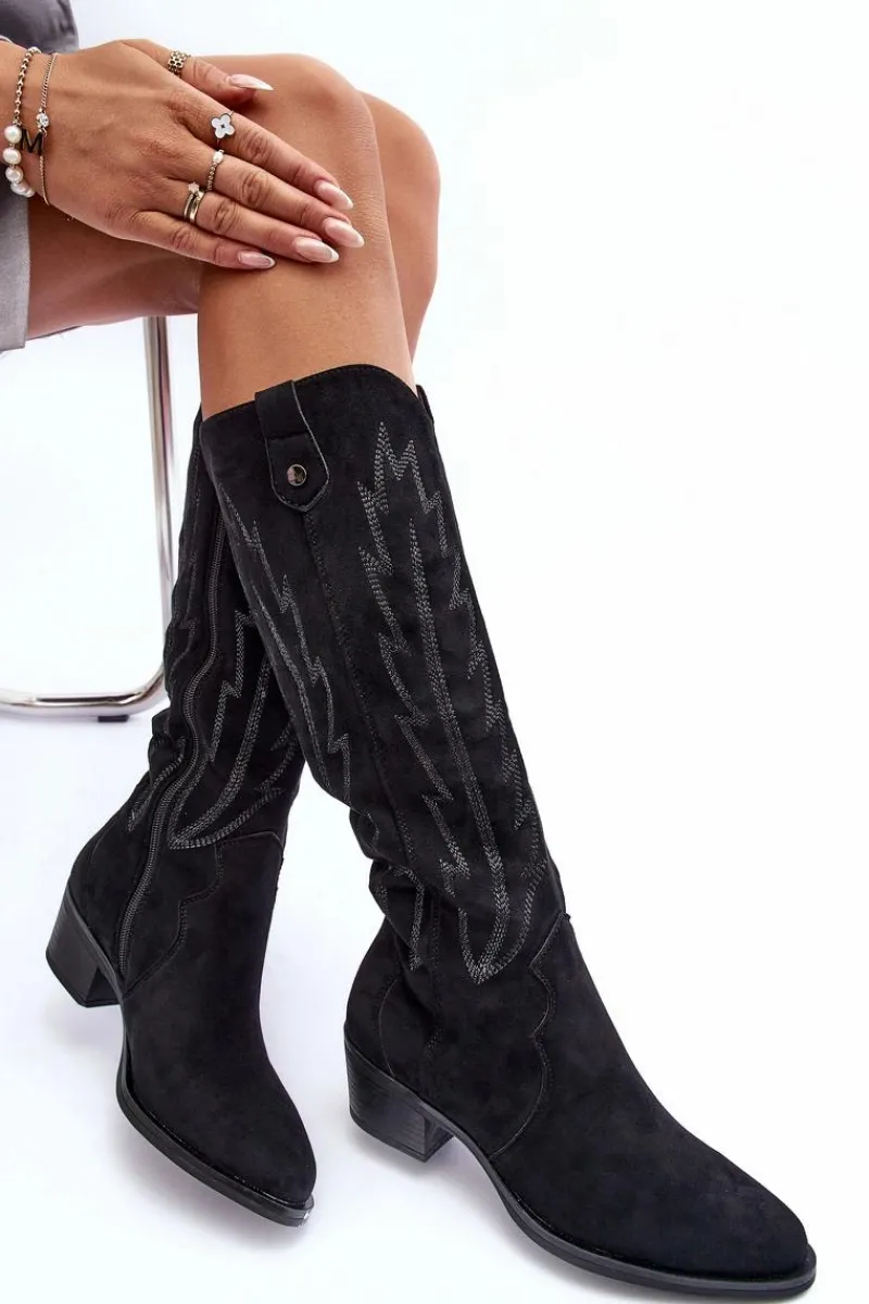 Ten model skradnie serce niejednej miłośniczce kozaków w stylu kowbojek! Świetnie sprawdzą się podczas jesiennych stylizacji! Model wykonany z miłego eko zamszu z delikatnymi przeszyciami na cholewce. Kozaki zapinane są na suwak. Osadzone na niskim, stabilnym obcasie. Ocieplone wewnątrz kocem obuwniczym. Nosek w szpic optycznie wysmukli nogi. Kozaki posiadają usztywniany zapiętek. Przy wyborze rozmiaru prosimy sugerować się tabelą rozmiarów.