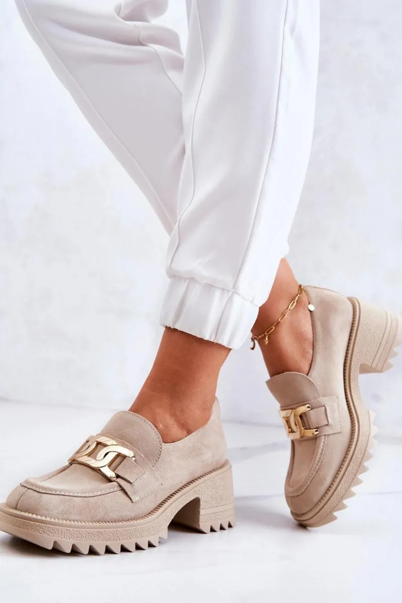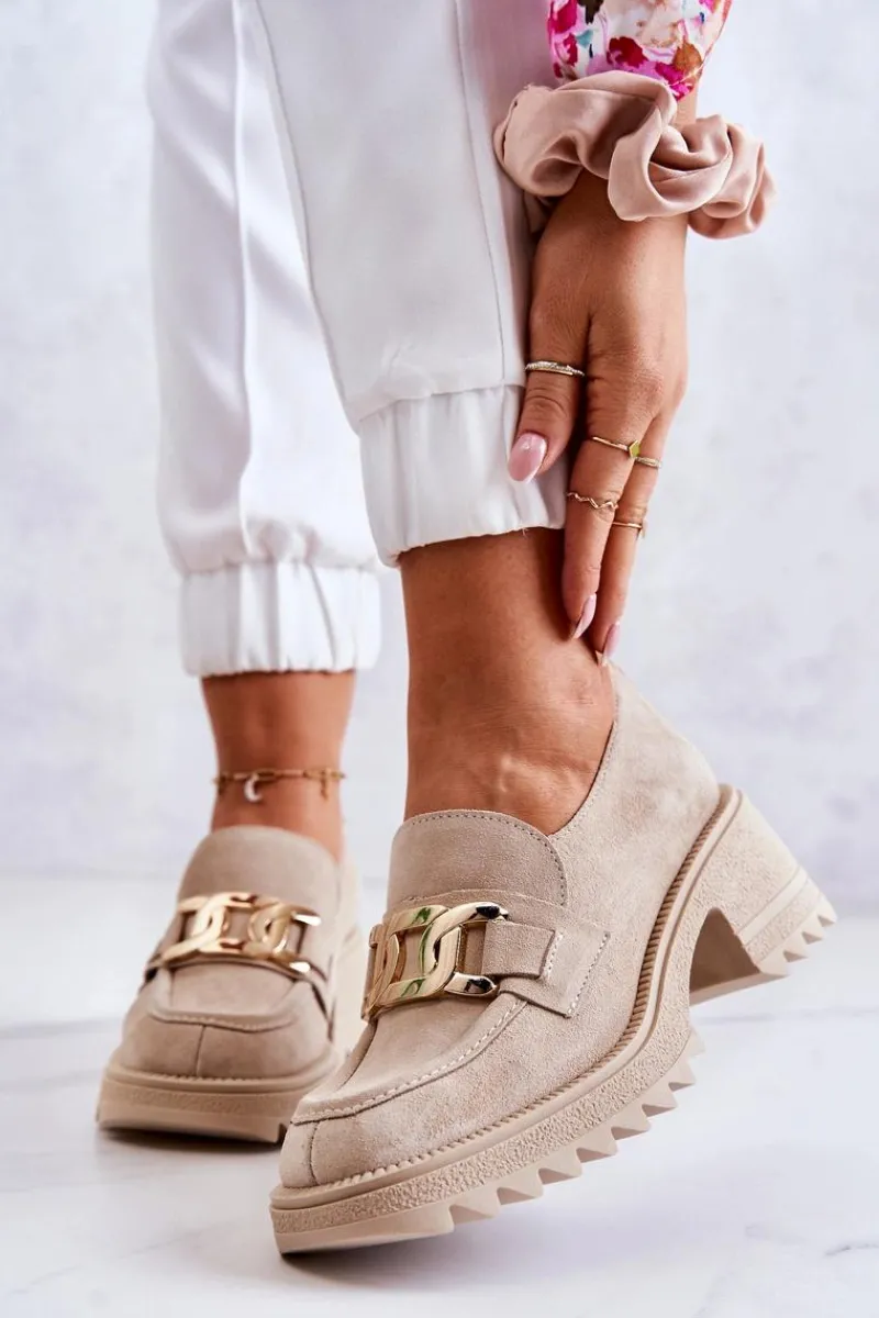 Te półbuty to HIT sezonu ! Wykonane z naturalnego zamszu. Posiadają masywny obcas w postaci słupka oraz platformę wykonaną z antypoślizgowego, gumowego tworzywa. Ozdoba na przodzie została wykonana z tworzywa sztucznego. Nosek zakryty, kwadratowy. Pod językiem znajduje się gumka, która pozwoli na odpowiednie dopasowanie obuwia do tęgości nogi. Usztywniany zapiętek. Wkładka skórzana zapewni komfort podczas użytkowania. Ten model będzie pasować do wielu stylizacji! Przy wyborze rozmiaru prosimy sugerować się tabelą rozmiarów.