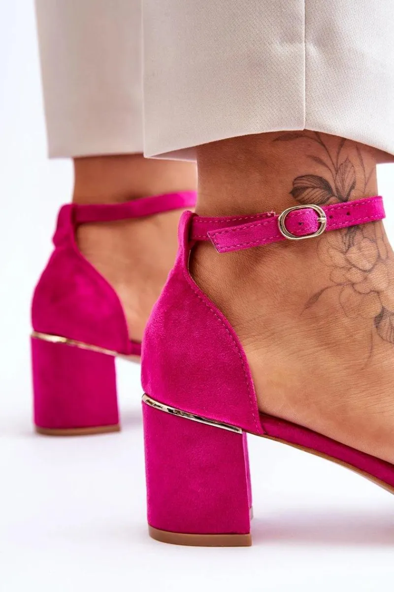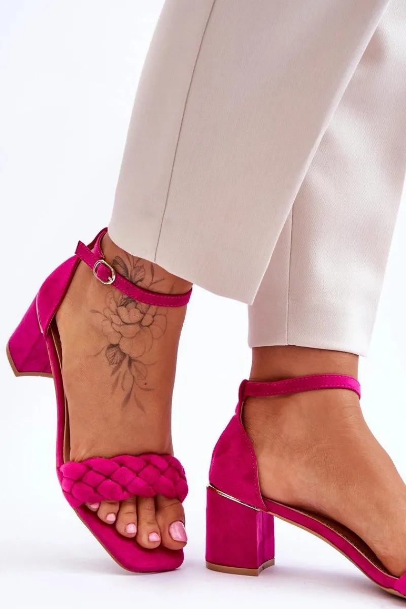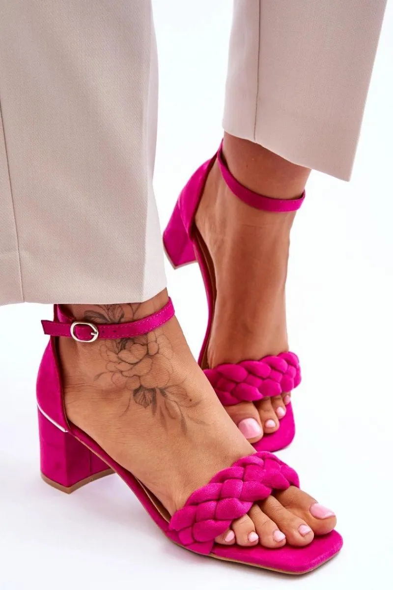 Eleganckie sandały damskie zostały osadzone na obcasie w postaci słupka. Wykonane z miłego w dotyku eko zamszu. Posiadają ozdobny pasek w formie warkocza na przodzie obuwia. Zapinane wokół kostki na sprzączkę z regulowanym paskiem. Miękka wkładka z eko skóry oraz wygodny obcas zapewnią komfort podczas użytkowania. Świetnie sprawdzą się na spotkania biznesowe, uroczystości rodzinne czy romantyczny spacer. Przy wyborze rozmiaru prosimy sugerować się tabelą rozmiarów.
