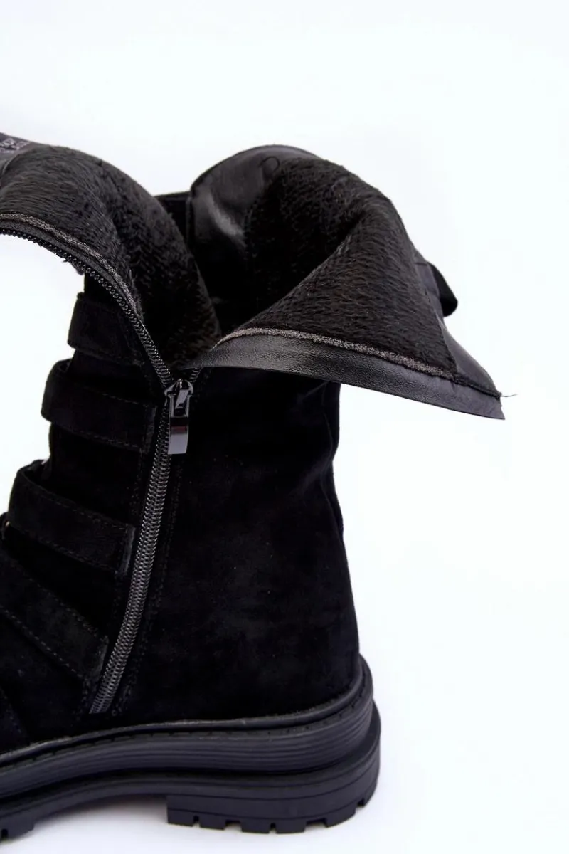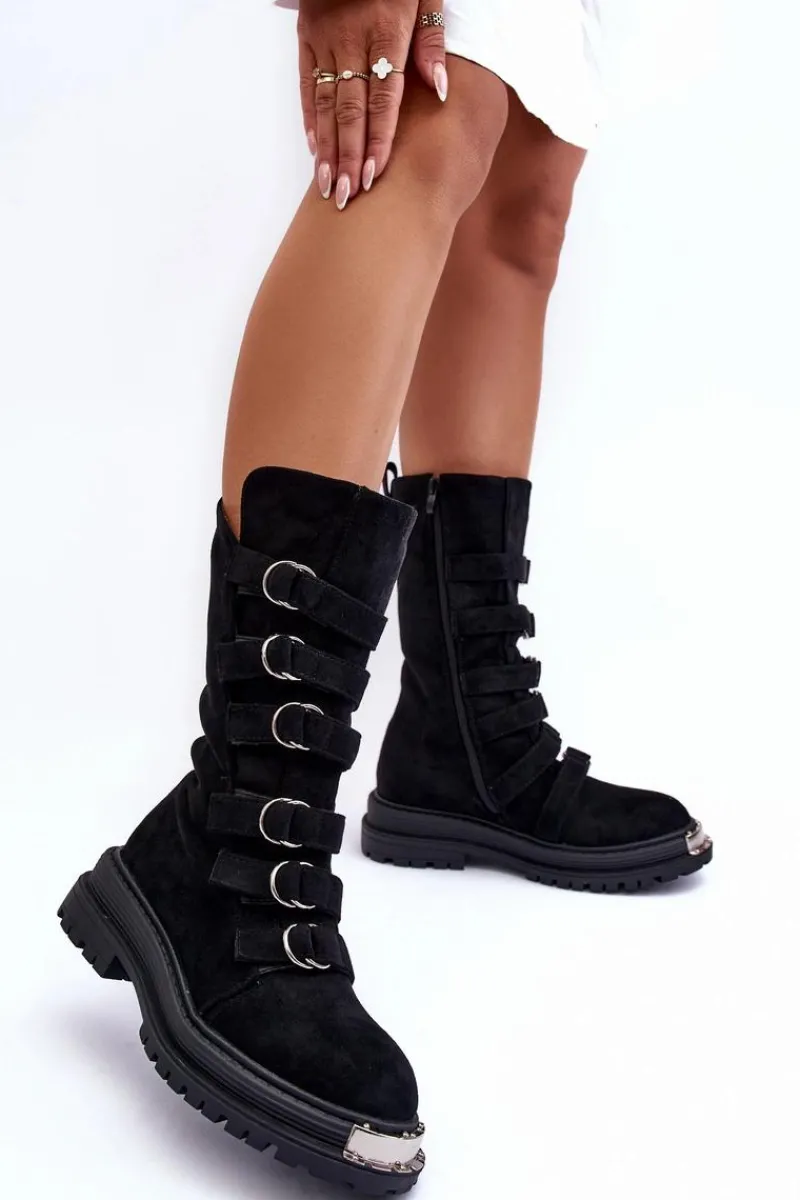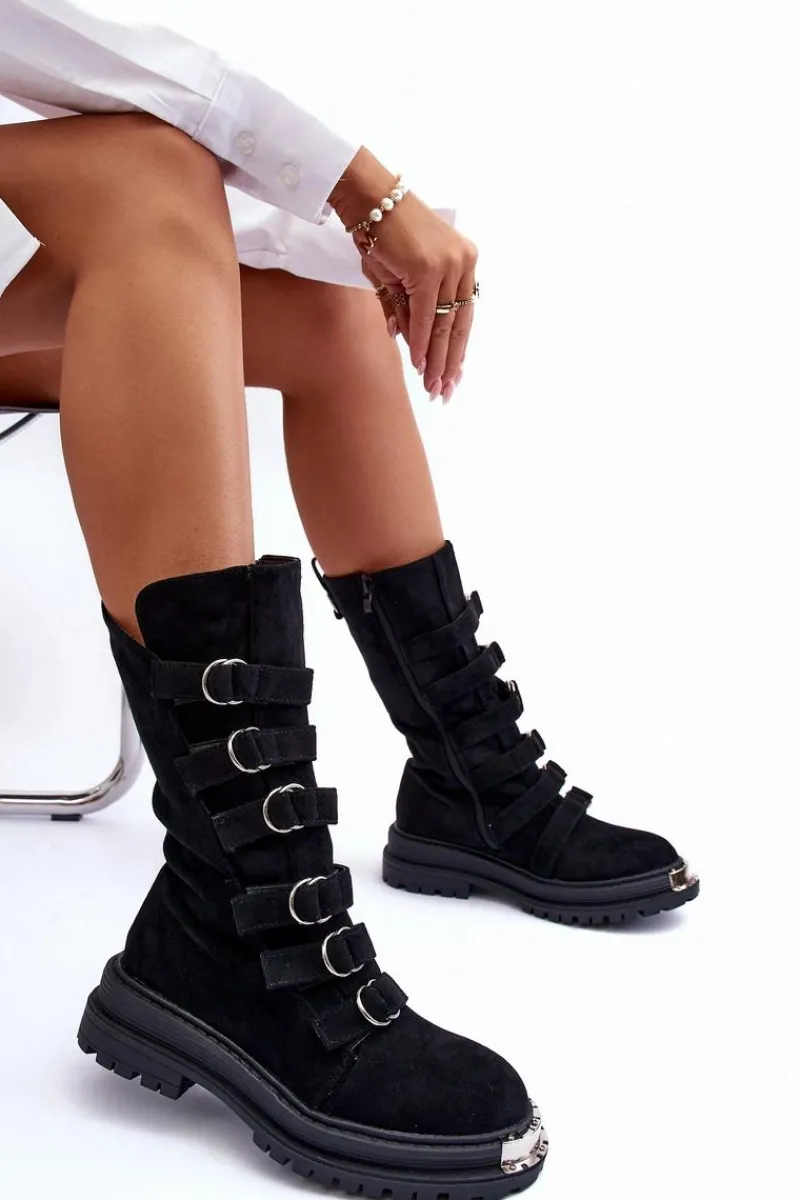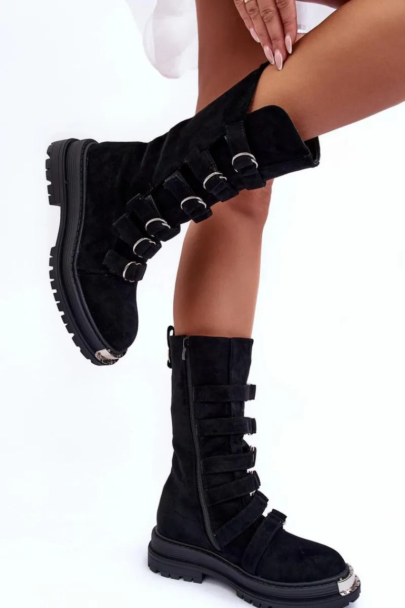 Wysokie workery damskie osadzone na płaskim obcasie oraz platformie. Zapinane na suwak po wewnętrznej stronie cholewki. Wykonane z eko zamszu. Noski zaokrąglone. Z przodu regulowane paseczki. Usztywniony zapiętek pozwoli na odpowiednią stabilizację stopy. Środek ocieplony kocem obuwniczym. Przy wyborze rozmiaru prosimy sugerować się tabelą rozmiarów.