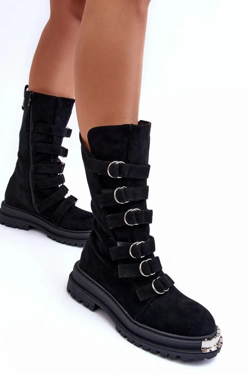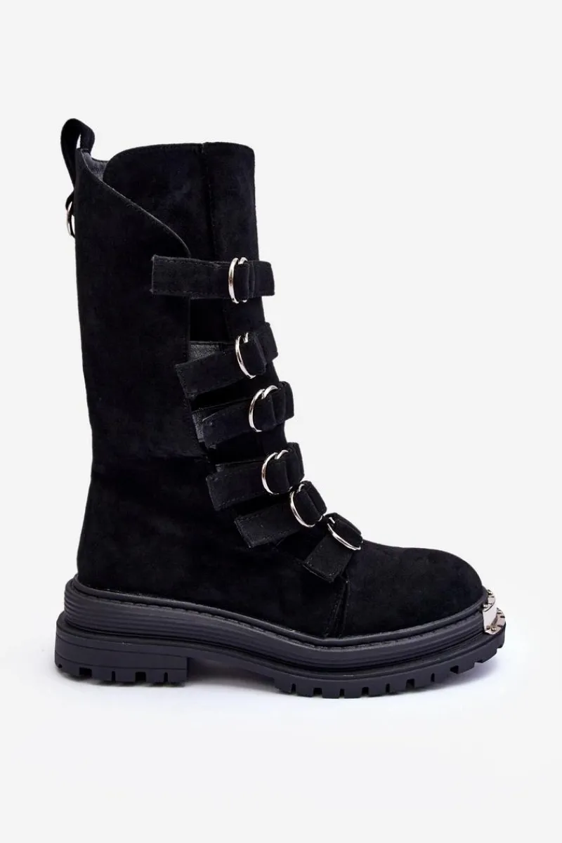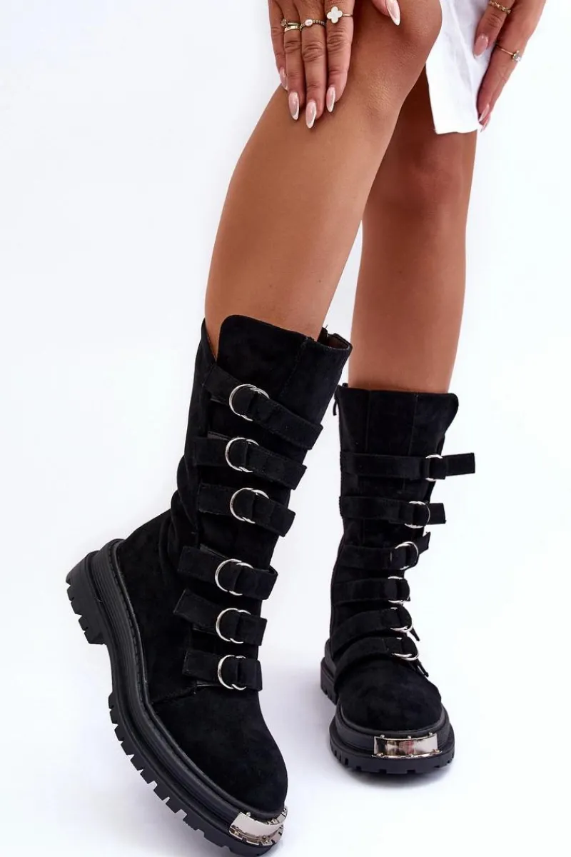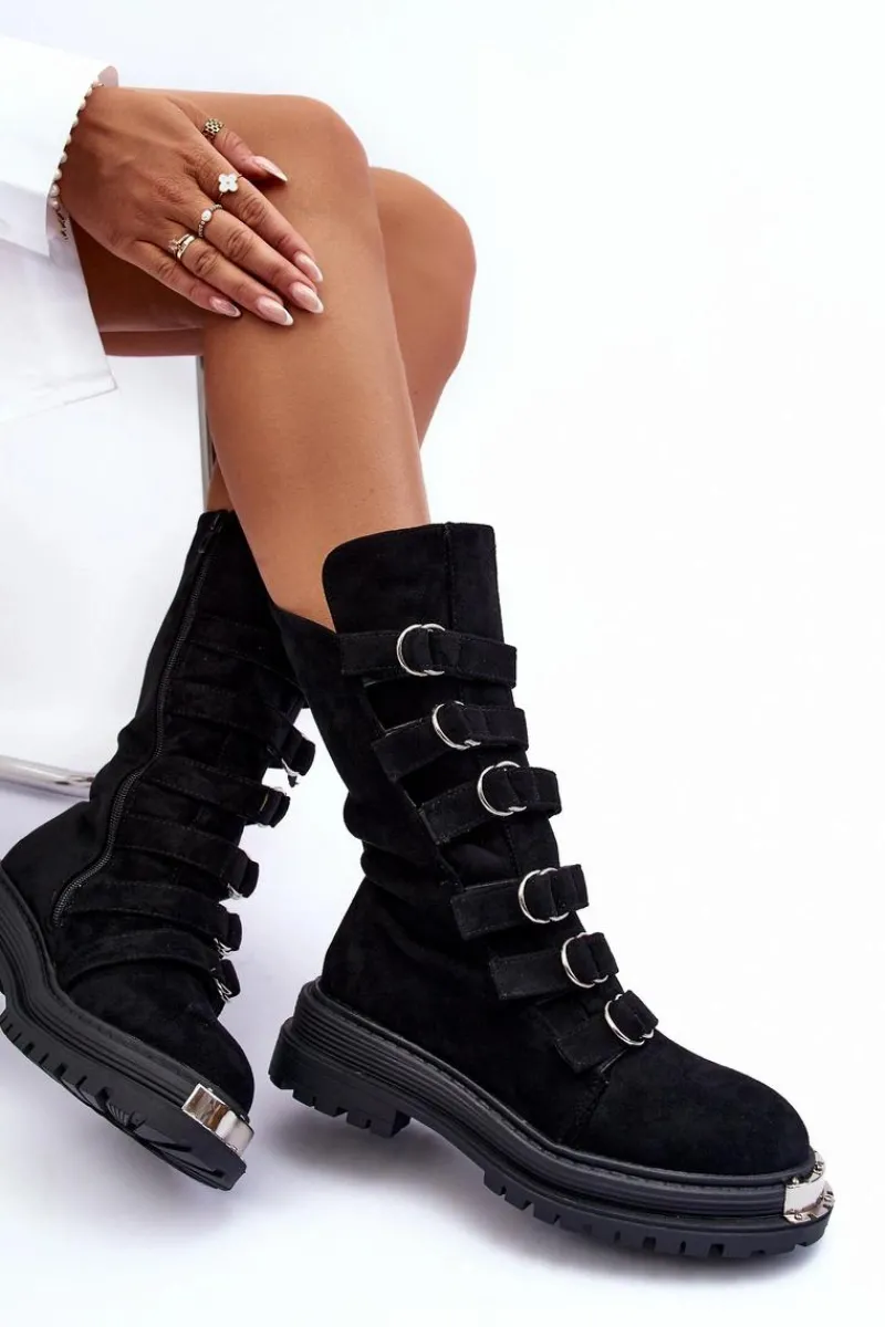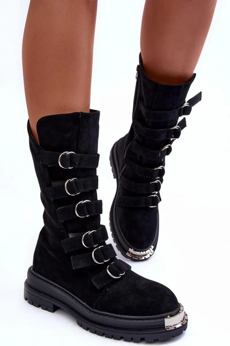 Wysokie workery damskie osadzone na płaskim obcasie oraz platformie. Zapinane na suwak po wewnętrznej stronie cholewki. Wykonane z eko zamszu. Noski zaokrąglone. Z przodu regulowane paseczki. Usztywniony zapiętek pozwoli na odpowiednią stabilizację stopy. Środek ocieplony kocem obuwniczym. Przy wyborze rozmiaru prosimy sugerować się tabelą rozmiarów.