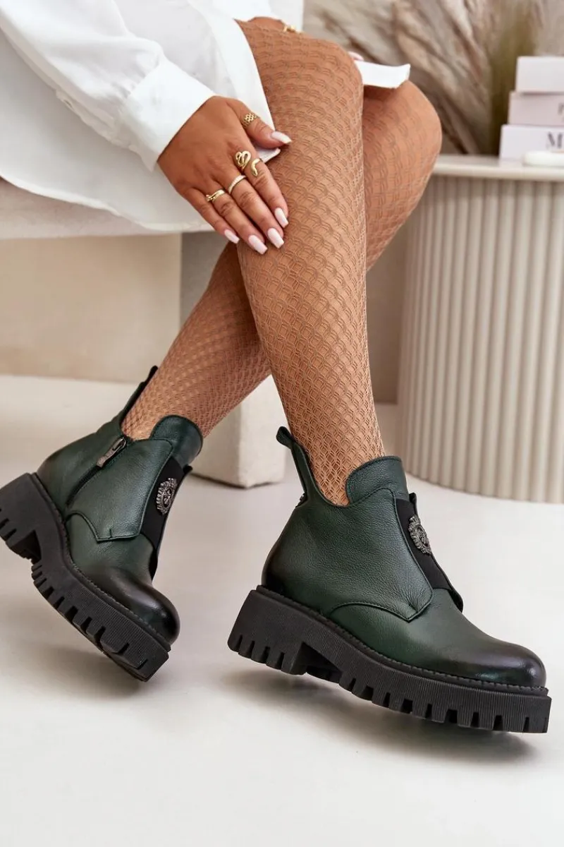 Damskie botki zostały wykonane z wysokiej jakości naturalnej skóry. Osadzone na masywnym obcasie i platformie ze żłobieniami. Model zapinany na suwak po wewnętrznej stronie cholewki. Z przodu na elastycznej wstawce znajduje się ozdoba z tworzywa sztucznego. Wnętrze ocieplone kocem obuwniczym. Ten wyjątkowy model wzbogaci wiele Twoich stylizacji! Przy wyborze rozmiaru prosimy sugerować się tabelą rozmiarów.